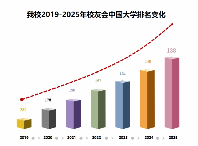 1月6日,艾瑞深中國校友會網(wǎng)發(fā)布校友會2025中國大學(xué)排名榜單,我校綜合排名位居全國第138位,實現(xiàn)六連升。標(biāo)志著我校在第三次黨代會確立的“三步走”復(fù)興期建設(shè)中邁出了堅實步伐,彰顯了學(xué)校近年來各項事業(yè)的蓬勃發(fā)展。