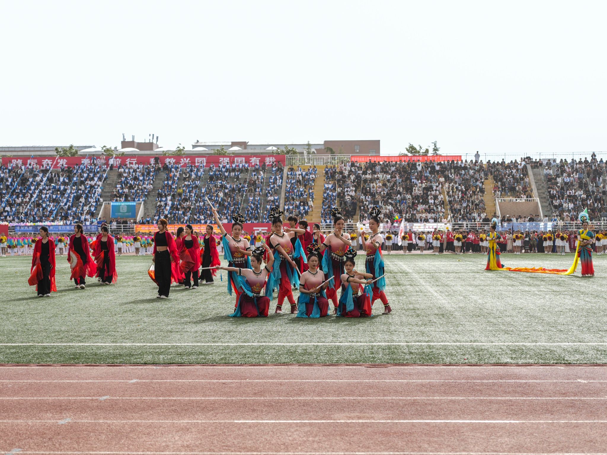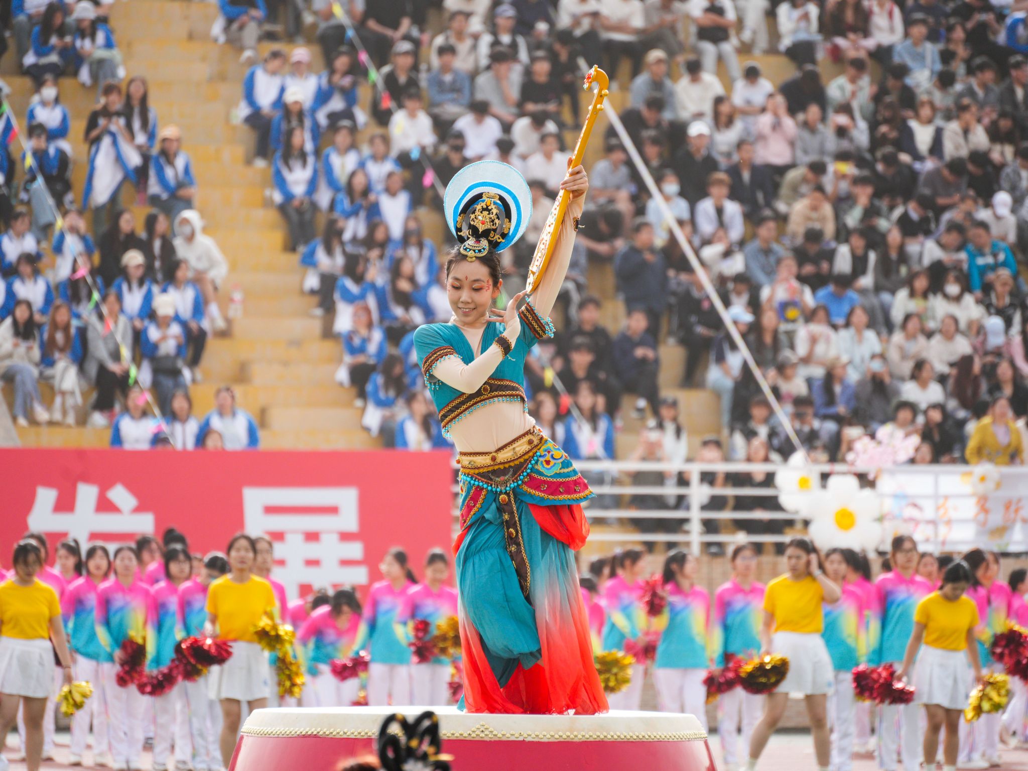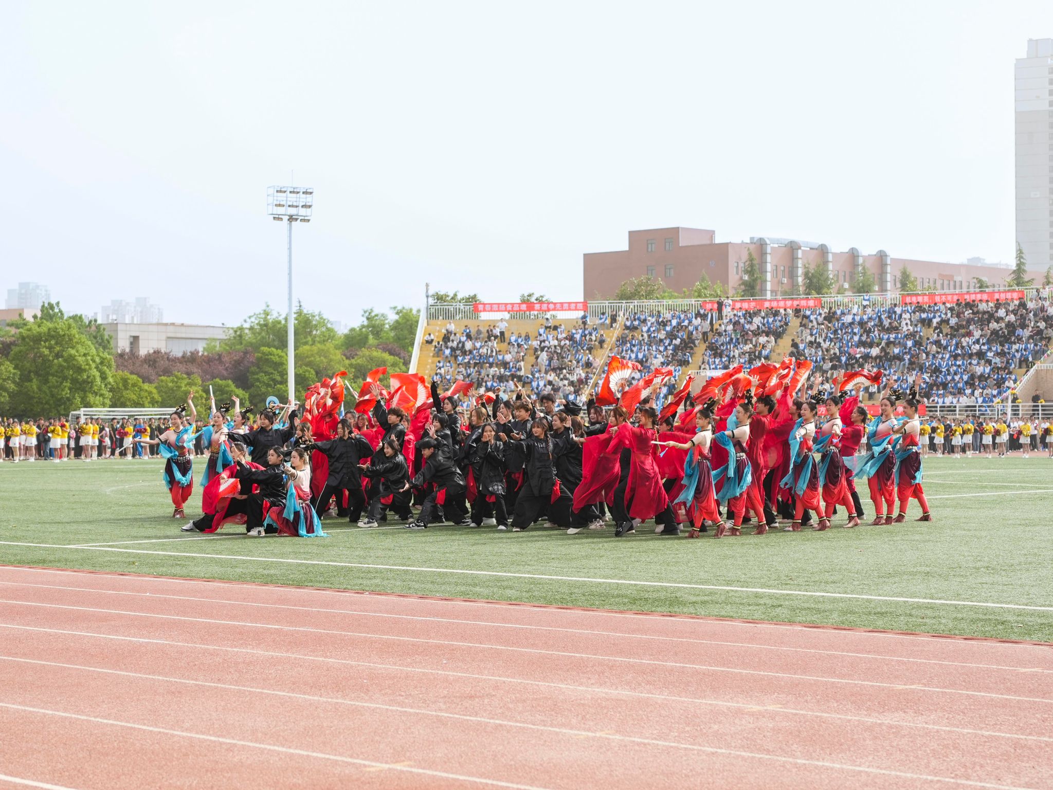 特色表演環(huán)節(jié),1200余名學(xué)子陸續(xù)上場(chǎng),帶來(lái)《舞韻中華》《青春飛揚(yáng)》《體舞芳華》《逐光環(huán)影》《中華武術(shù)》《祝福祖國(guó)》等團(tuán)體操、舞蹈、武術(shù)表演,他們笑容燦爛、活力四射,以優(yōu)美的舞姿為田徑運(yùn)動(dòng)會(huì)加油喝彩。