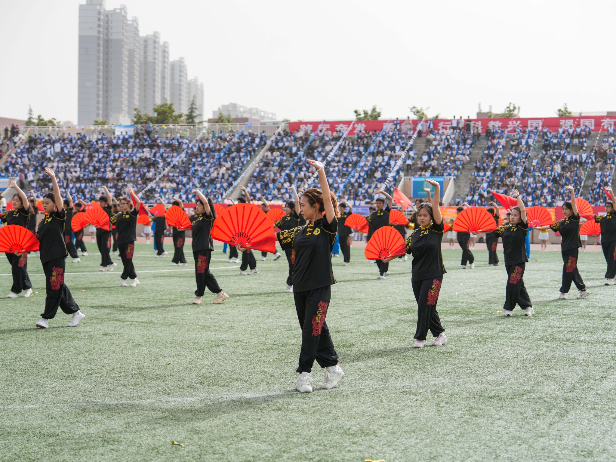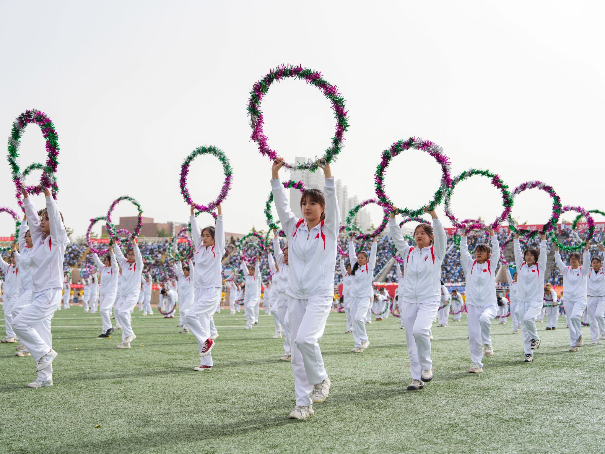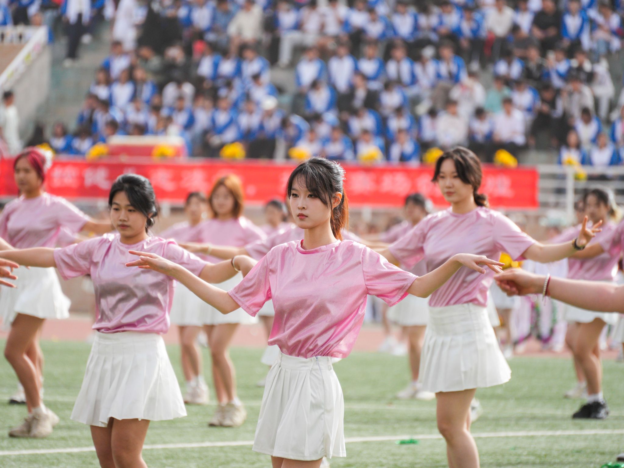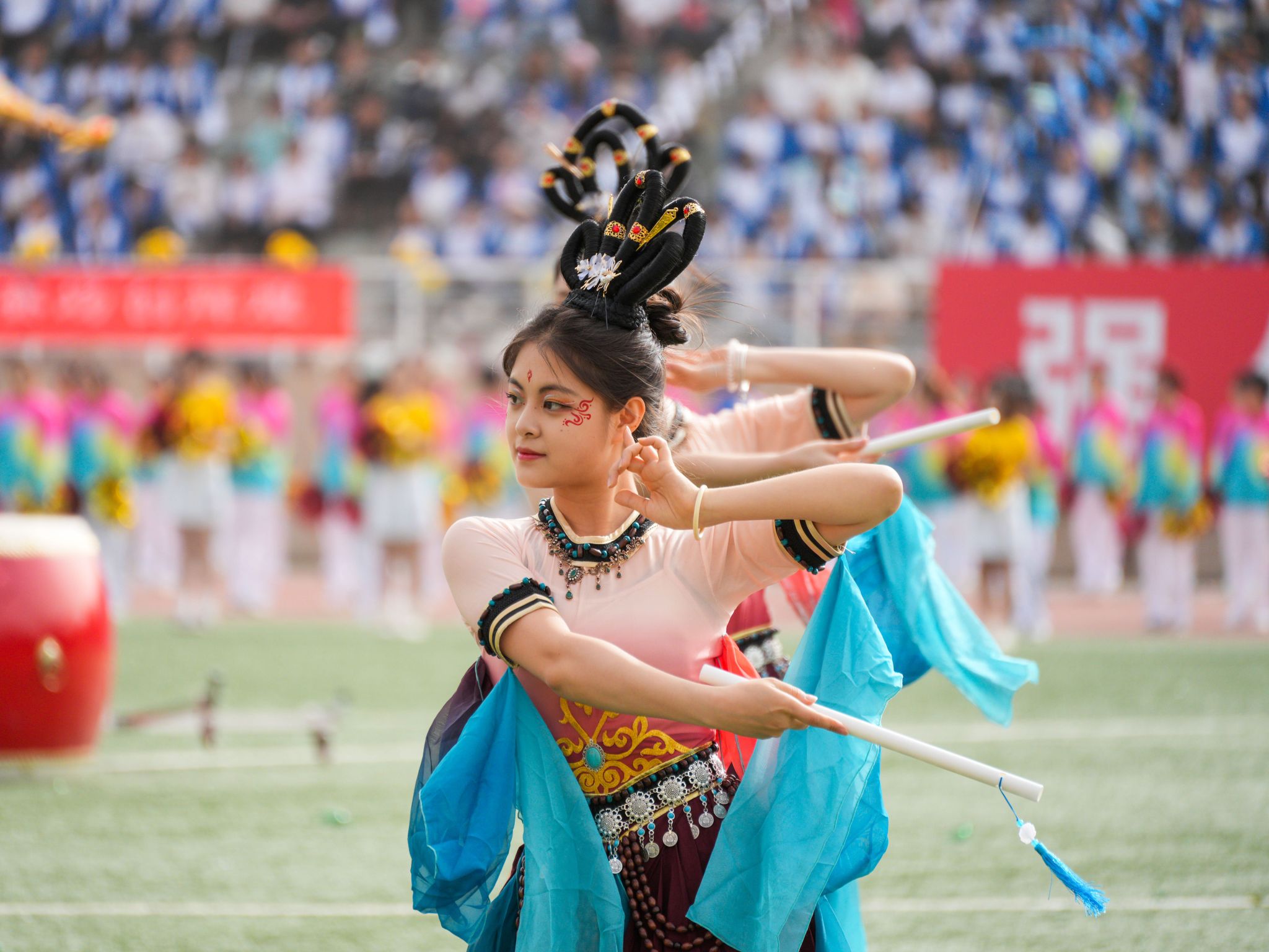 特色表演環(huán)節(jié),1200余名學(xué)子陸續(xù)上場(chǎng),帶來(lái)《舞韻中華》《青春飛揚(yáng)》《體舞芳華》《逐光環(huán)影》《中華武術(shù)》《祝福祖國(guó)》等團(tuán)體操、舞蹈、武術(shù)表演,他們笑容燦爛、活力四射,以優(yōu)美的舞姿為田徑運(yùn)動(dòng)會(huì)加油喝彩。