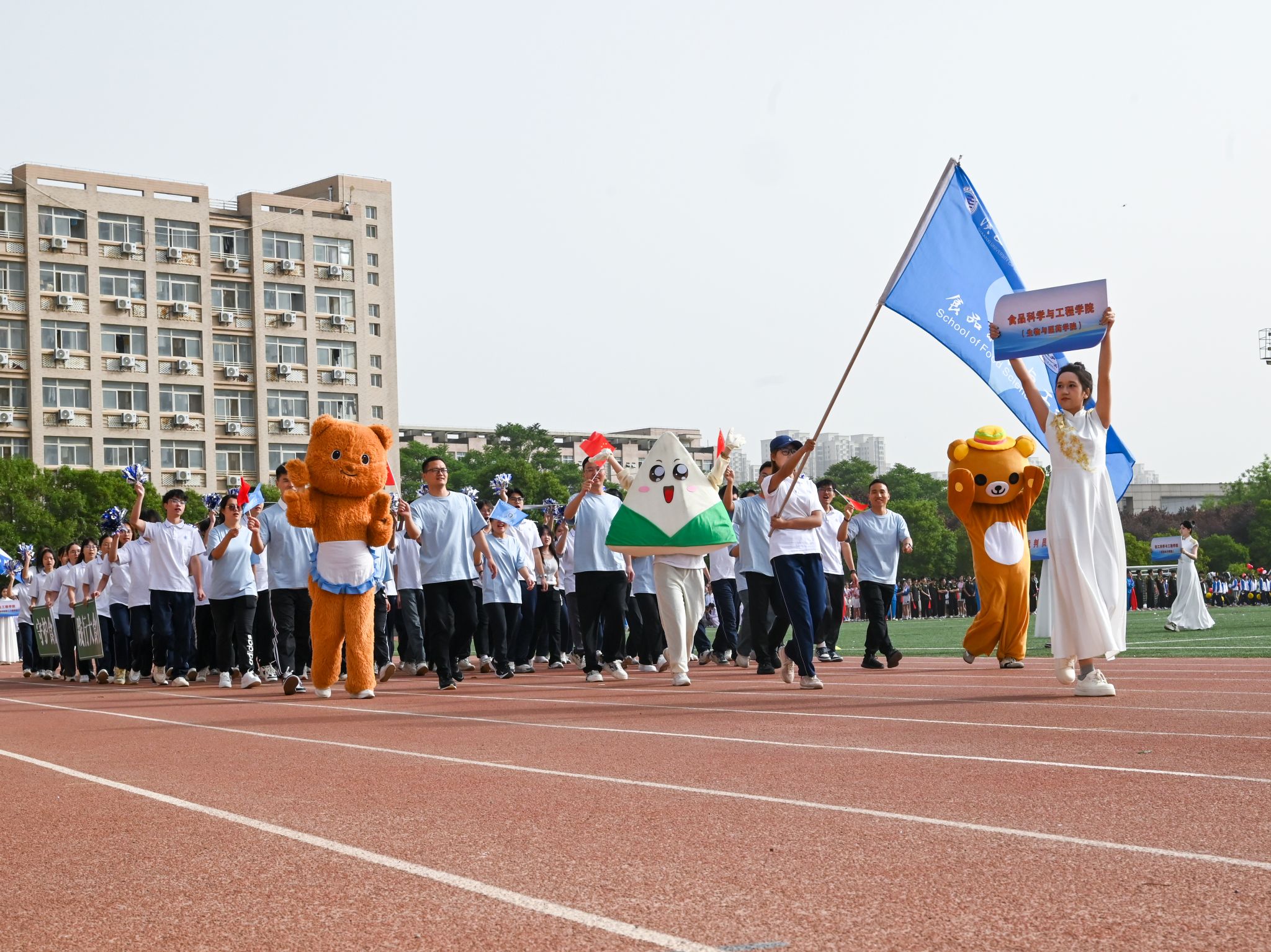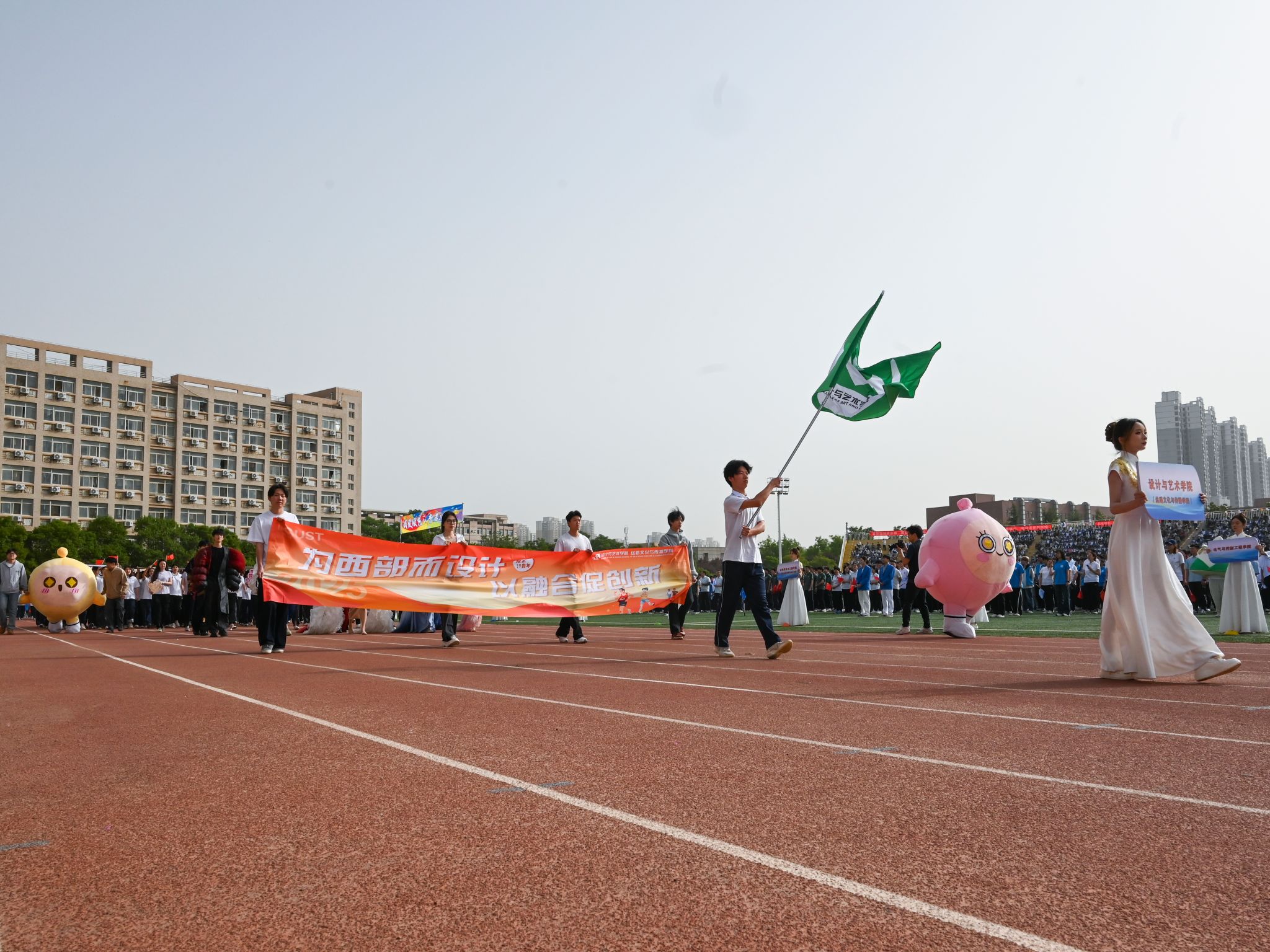 方陣入場(chǎng),氣勢(shì)如虹。激昂的《運(yùn)動(dòng)員進(jìn)行曲》中,各方陣邁著鏗鏘有力的步伐逐一亮相。他們步伐穩(wěn)健、口號(hào)嘹亮。幼兒園小朋友方陣充滿童真與活力;裁判員、志愿者方陣體現(xiàn)嚴(yán)謹(jǐn)公正;各學(xué)院方陣或身著民族服飾,或手持花束與展示牌,彰顯了陜科大師生“百舸爭(zhēng)流奮舟楫、踔厲奮發(fā)爭(zhēng)一流”的精神風(fēng)貌。