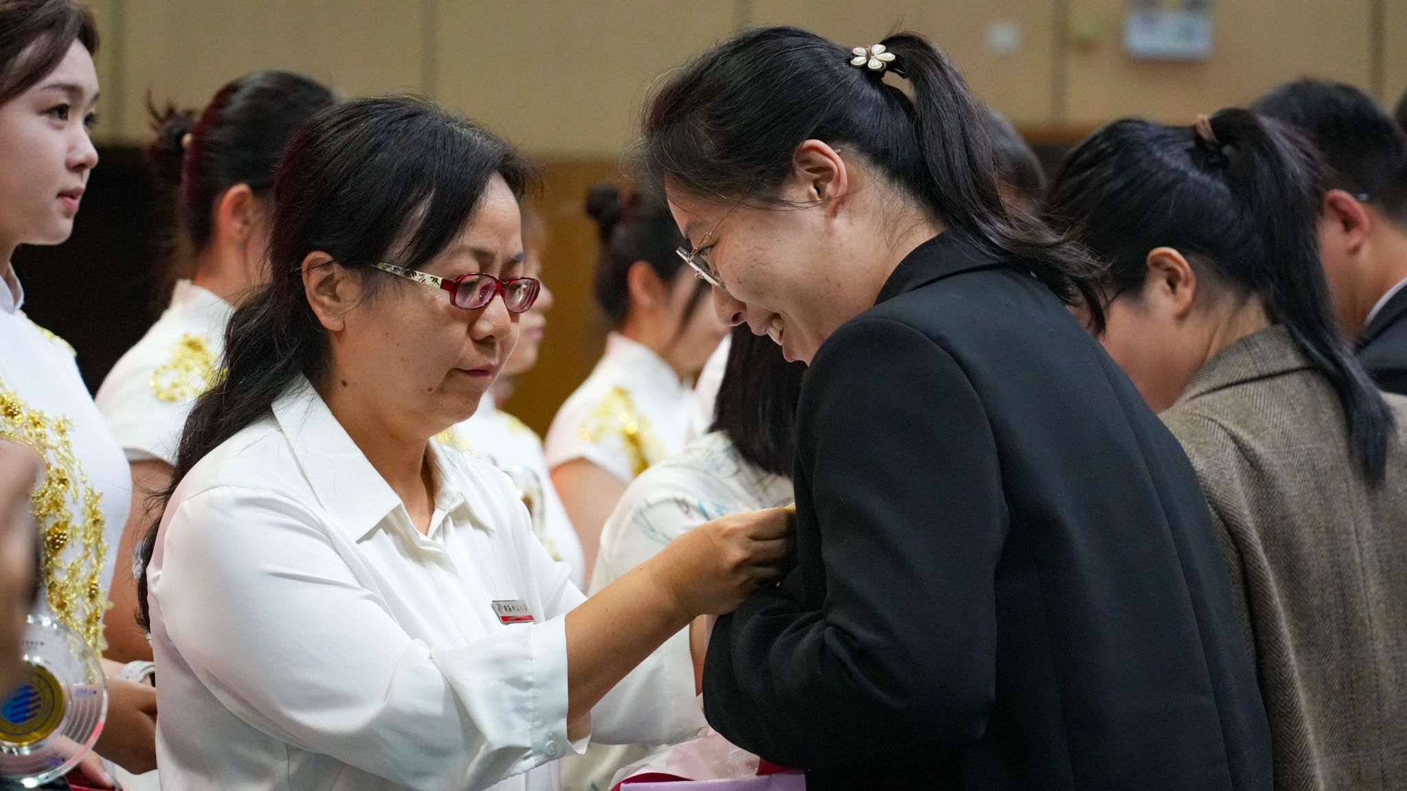 新進教師代表為從教滿三十年教師代表送上鮮花祝福,從教滿三十年教師代表為新進教師代表佩戴?;铡?/p>