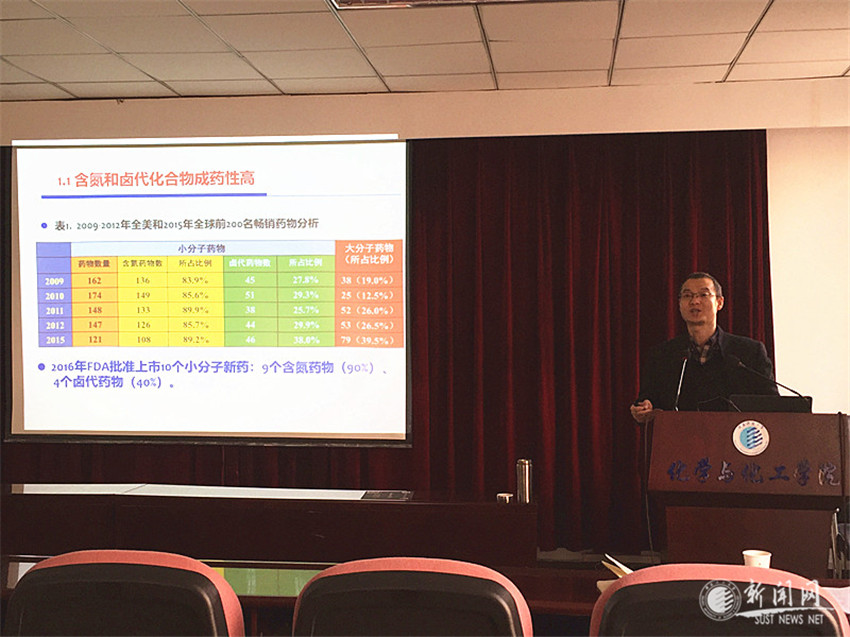 朱教授的報(bào)告從特殊環(huán)境下微生物天然產(chǎn)物出發(fā),介紹了在高鹽、高酸性、高堿性等特殊環(huán)境下的微生物活性產(chǎn)物方面的研究成果,并從海洋天然產(chǎn)物的成藥性、微生物天然產(chǎn)物的研究方法、海洋微生物產(chǎn)生的抗人直結(jié)腸癌活性產(chǎn)物三個(gè)方面展開。介紹了利用寡培、鹽脅迫、酸脅迫、混培和表觀遺傳修飾等方法,獲得含氮和鹵代等成藥性高的微生物活性天然產(chǎn)物。朱教授的報(bào)告深入淺出,不僅介紹了微生物活性產(chǎn)物的基本知識(shí),而且詳細(xì)介紹了不同特殊環(huán)境下的天然產(chǎn)物的獲得方法。朱教授還和到場(chǎng)的師生就天然產(chǎn)物的合成和微生物天然產(chǎn)物的調(diào)控制備等方面的問題進(jìn)行了交流互動(dòng)。