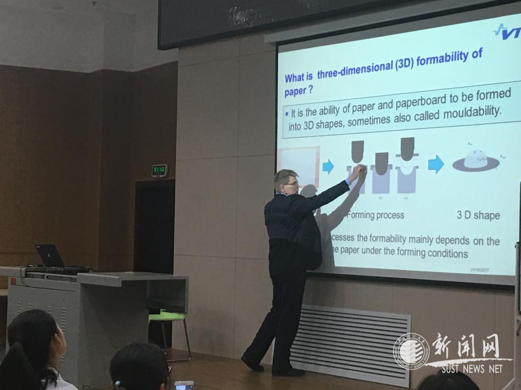 Elias教授做了制漿造紙相關(guān)領(lǐng)域的系列專題報告“Three-dimensional formability of paper”和“Tool for evaluation of the quality of recycled fiber material”。系統(tǒng)講述了國外造紙企業(yè)、研究院等在纖維素包裝材料制品領(lǐng)域的研究探索,重點(diǎn)介紹了在包裝材料制作工藝、技術(shù)層面的創(chuàng)新實例,及在補(bǔ)充石油基包裝材料缺陷方面的優(yōu)勢,為纖維包裝材料的應(yīng)用提供理論依據(jù)。報告中清晰的研究思路、創(chuàng)新的實驗設(shè)想和嚴(yán)謹(jǐn)?shù)臄?shù)據(jù)分析,對啟發(fā)和提高我院師生的科研思路和水平很有幫助,拓寬了學(xué)生的知識與眼界,師生們積極地參與了后續(xù)的答疑解惑環(huán)節(jié),Elias教授認(rèn)真聽取了各種問題并且悉心做出解答。