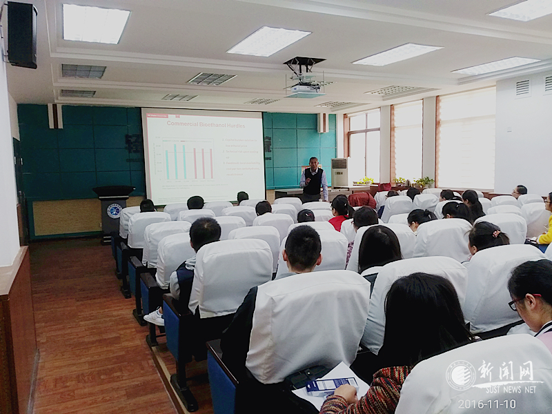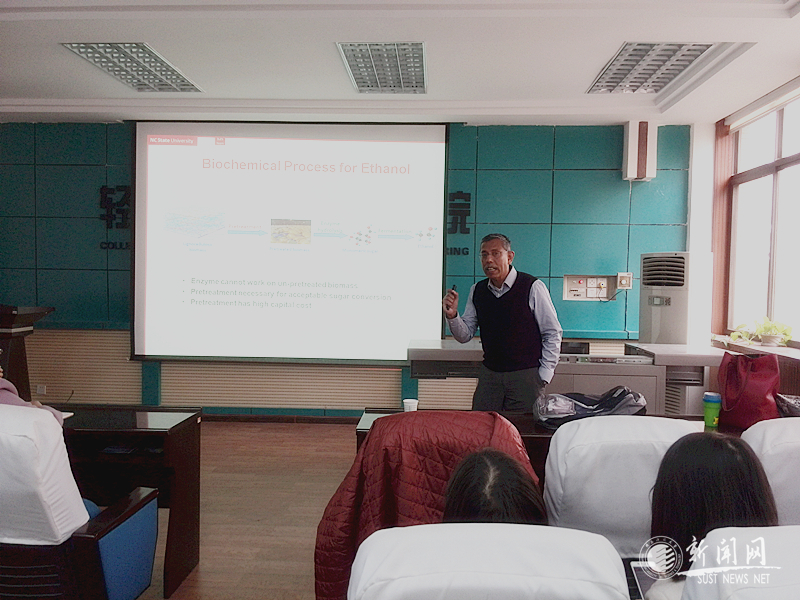 實(shí)驗(yàn)樓1B318他為在座學(xué)生作了題為“高溫預(yù)水解結(jié)合機(jī)械磨漿用于木質(zhì)纖維及木素生產(chǎn)高值化產(chǎn)品”的學(xué)術(shù)報(bào)告。本場(chǎng)報(bào)告會(huì)由輕工科學(xué)與工程學(xué)院副院長(zhǎng)張素風(fēng)教授主持,為我?!皩?dǎo)師論壇”系列學(xué)術(shù)報(bào)告。報(bào)告中,漢森·嘉米爾(Hasan Jameel)教授首先介紹了生物質(zhì)精煉的內(nèi)涵、發(fā)展及前景,主要從燃料乙醇與生物柴油轉(zhuǎn)化,琥珀酸、糠醛、羥甲基糠醛等高附加值化學(xué)品轉(zhuǎn)化,以及木素基膠黏劑與泡沫材料等方面進(jìn)行了詳細(xì)闡述。他重點(diǎn)講述了高溫預(yù)水解結(jié)合機(jī)械法磨漿預(yù)處理在生物質(zhì)精煉中的重要性與優(yōu)勢(shì),其優(yōu)勢(shì)在于綠色環(huán)保性、低成本、弱腐蝕性、與酸預(yù)處理相比具有較少的降解產(chǎn)物、無硫殘余物(木素),有利于高附加值產(chǎn)品轉(zhuǎn)化等。隨后他又闡述了由于成本較高導(dǎo)致木質(zhì)纖維素轉(zhuǎn)化乙醇此路線受制約的問題,因此未來需要將預(yù)處理后所得木聚糖、纖維素、木素等進(jìn)行分離分級(jí),進(jìn)而轉(zhuǎn)化為不同化學(xué)品材料,如木材膠黏劑、泡沫材料等。
