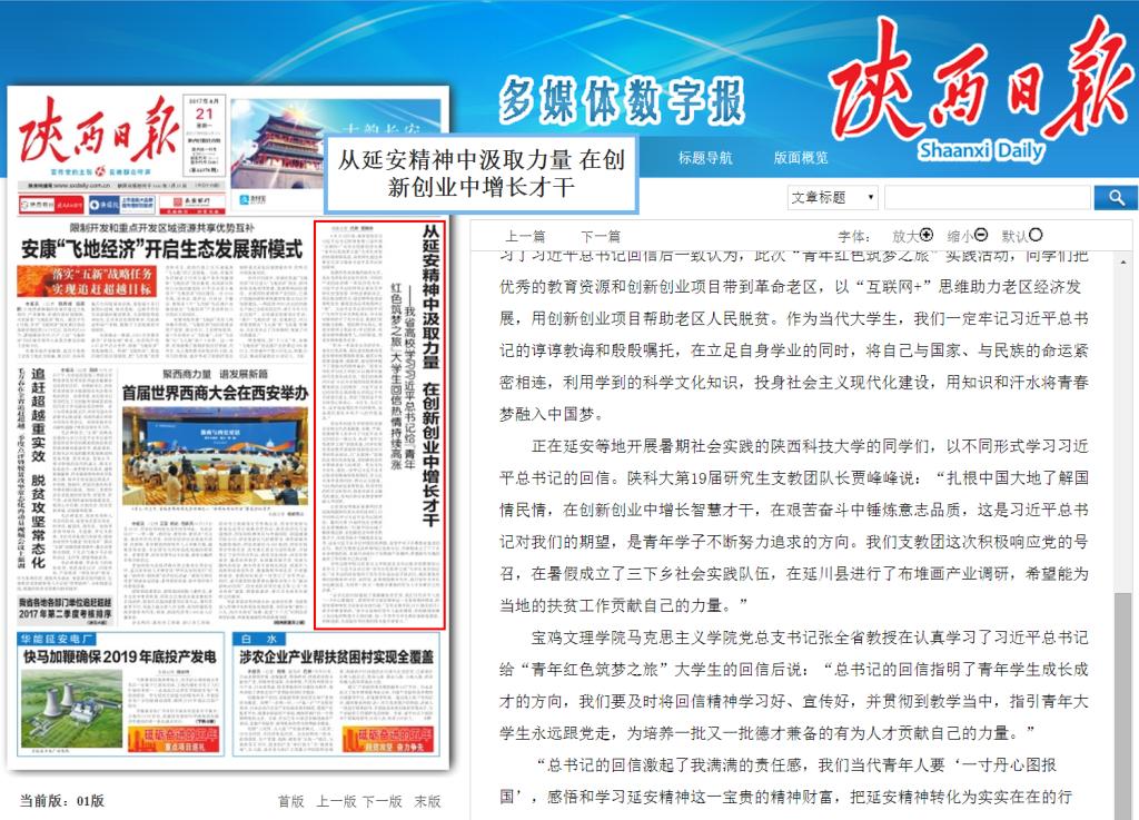 8月21日,《陜西日報(bào)》要聞版以“從延安精神中汲取力量 在創(chuàng)新創(chuàng)業(yè)中增長才干”為題,在《我省高校學(xué)習(xí)習(xí)近平總書記給“青年紅色筑夢之旅”大學(xué)生回信熱情持續(xù)高漲》系列報(bào)道中,報(bào)道了陜西科技大學(xué)青年學(xué)子以不同形式學(xué)習(xí)習(xí)近平總書記的回信。