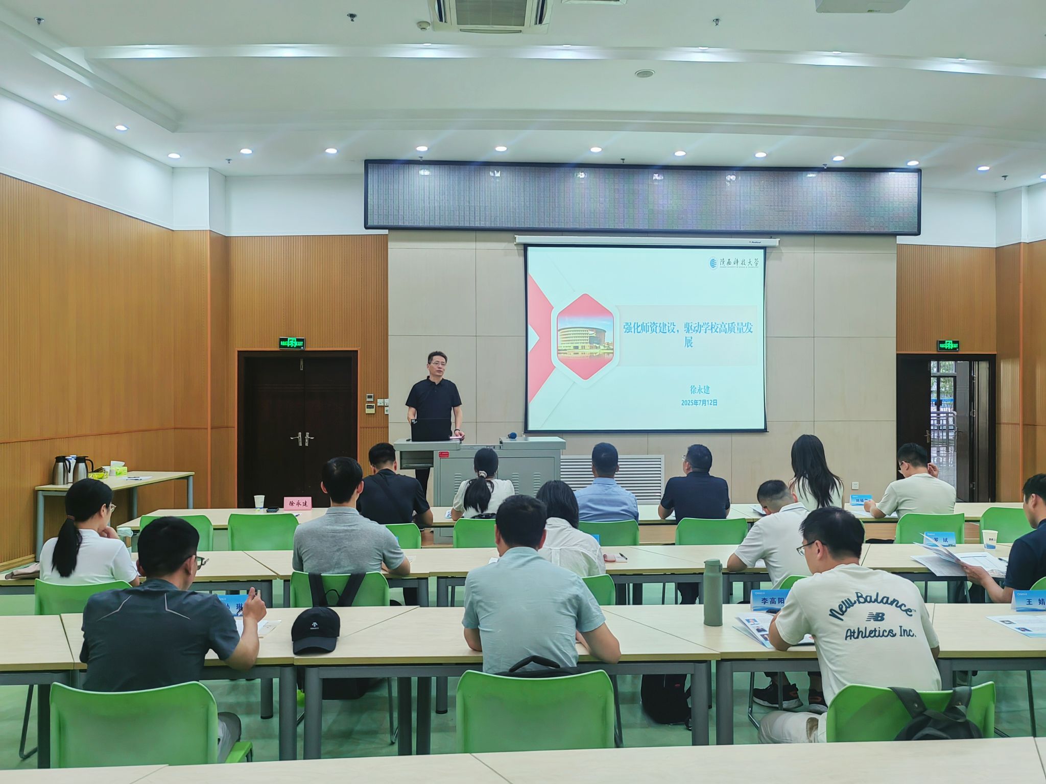 教師發(fā)展中心常務(wù)副主任徐永建作題為《強(qiáng)化師資隊伍建設(shè),驅(qū)動學(xué)校高質(zhì)量發(fā)展》開班動員講話。報告立足新時代教育強(qiáng)國建設(shè)背景,從教育、科技、人才“三位一體”戰(zhàn)略高度,深入分析師資隊伍建設(shè)的戰(zhàn)略意義,詳細(xì)解讀了學(xué)?!叭阶摺卑l(fā)展規(guī)劃,系統(tǒng)闡述“至誠計劃”、“至博計劃”、“卓越計劃”等教師培養(yǎng)體系的具體舉措與實施成效,為新進(jìn)教師職業(yè)發(fā)展指明方向。