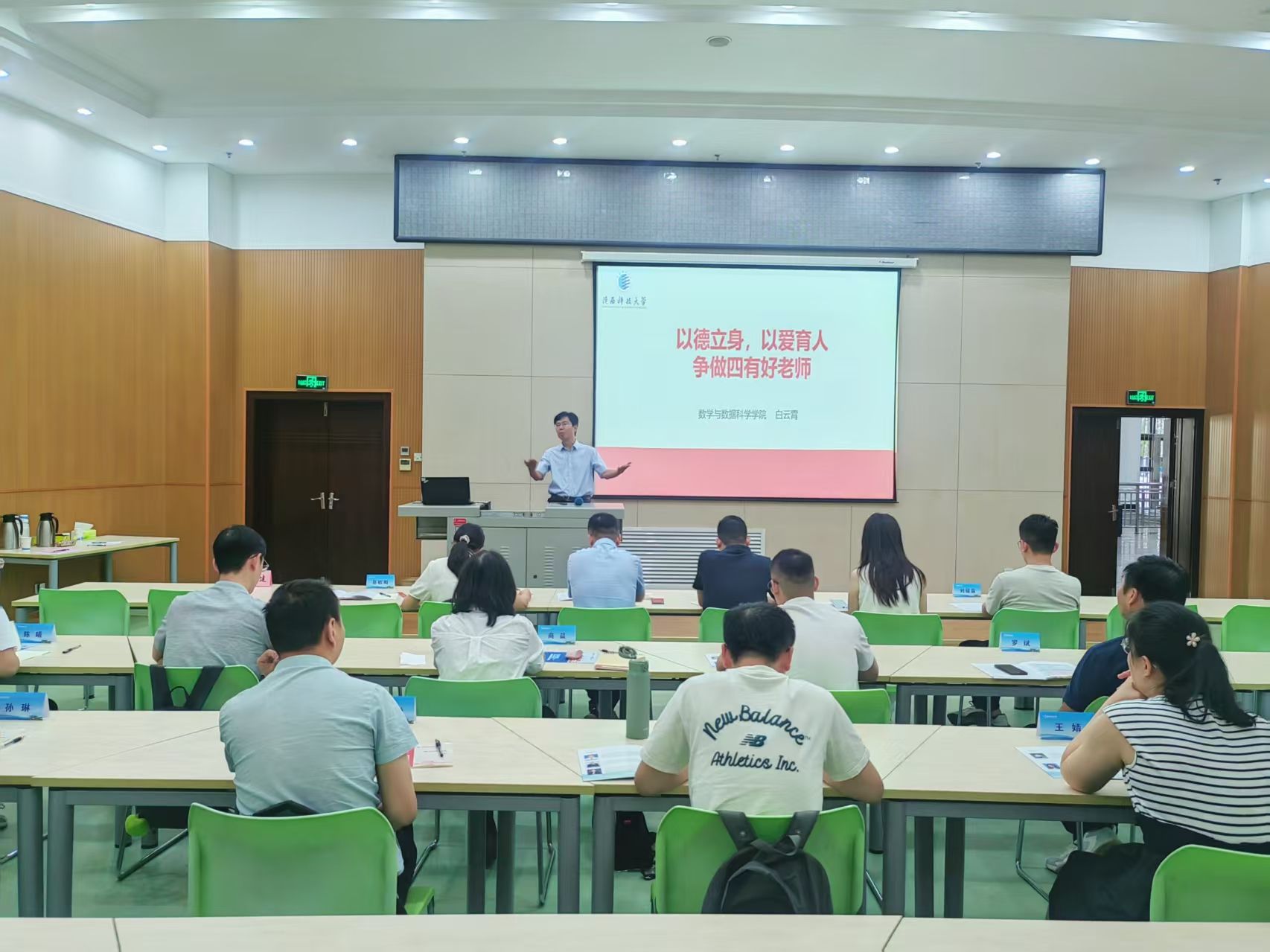 開班首場報告由數(shù)學(xué)與數(shù)據(jù)科學(xué)學(xué)院白云霄教授分享題為《以德立身,以愛育人—爭做四有好老師》的主題報告。白云霄結(jié)合自己三十余年從教經(jīng)歷,深入淺出地詮釋了"師德"與"師愛"的深刻內(nèi)涵。他談到,新時代教師不僅要傳授知識,更要塑造靈魂,要以德立身、以德立學(xué)、以德施教。他寄語青年教師要珍惜韶華、勇?lián)姑瑢€人發(fā)展融入學(xué)校發(fā)展大局,以"躬耕教壇,強(qiáng)國有我"的擔(dān)當(dāng)精神,在教書育人的崇高事業(yè)中實現(xiàn)人生價值。
