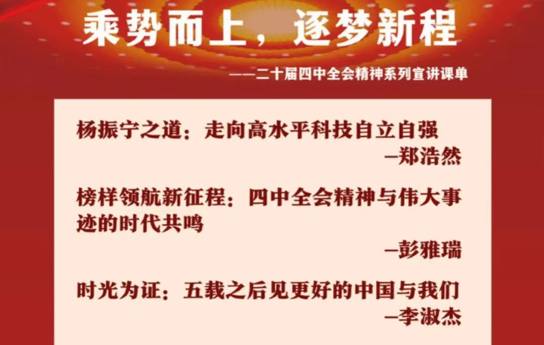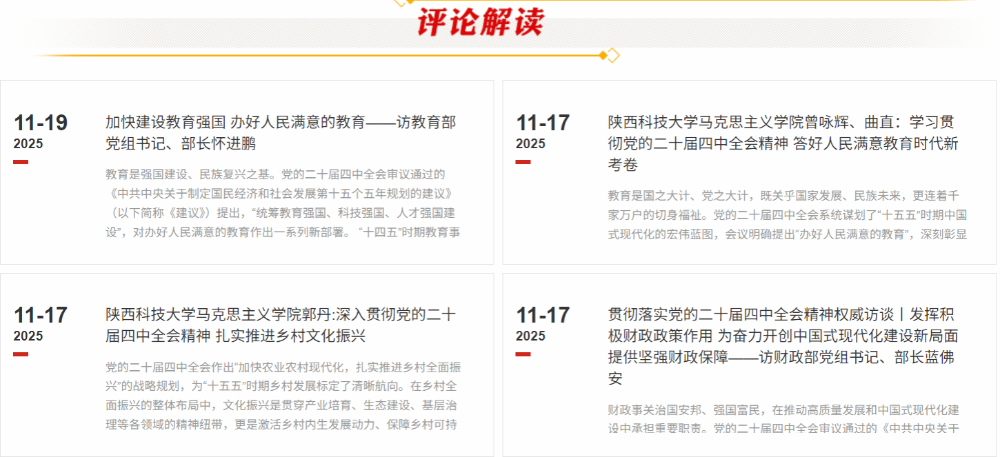 師生闡釋宣講推動學(xué)習(xí)宣傳貫徹工作落實落細(xì)。學(xué)院有重點(diǎn)地組織副高以上教師開展理論闡釋,圍繞全會精神如何更好融入思政課、辦好人民滿意教育、繁榮社會主義文化、提升中華文明傳播力影響力、扎實推進(jìn)鄉(xiāng)村全面振興、貫徹投資于人理念、科技創(chuàng)新產(chǎn)業(yè)創(chuàng)新,先后撰寫闡釋類文章十余篇。王飛教授應(yīng)邀為陜西鐵路物流集團(tuán)作黨的二十屆四中全會精神專題宣講。“紅色基因·薪火傳承”研究生宣講團(tuán)發(fā)布“乘勢而上,逐夢新程——二十屆四中全會精神系列宣講課單”,組織宣講團(tuán)成員深入校園內(nèi)外,傳播全會精神,擔(dān)當(dāng)理論宣傳使命。