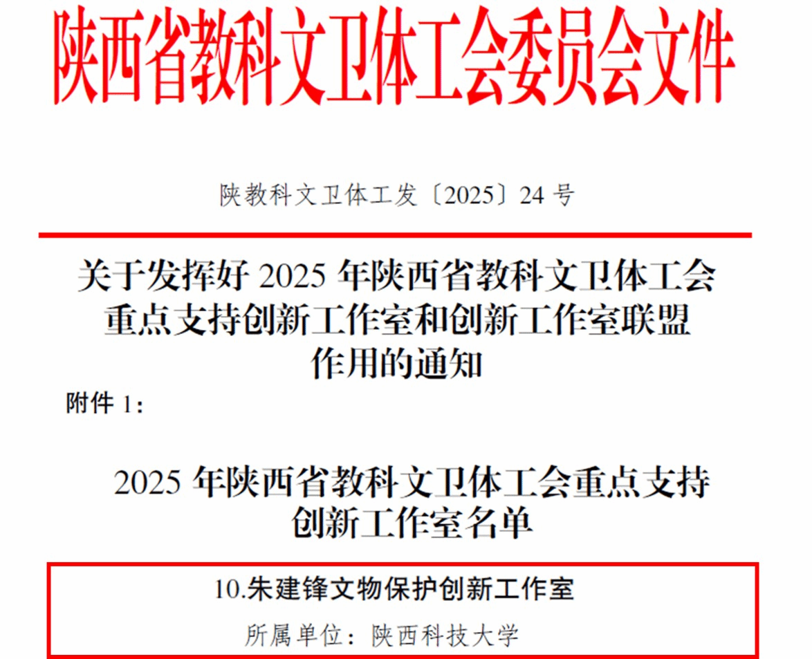 近日,在校工會(huì)的精心統(tǒng)籌與大力支持下,材料學(xué)院朱建鋒教授領(lǐng)銜的“文物保護(hù)創(chuàng)新工作室”成功入選陜西省教科文衛(wèi)體工會(huì)重點(diǎn)支持創(chuàng)新工作室。