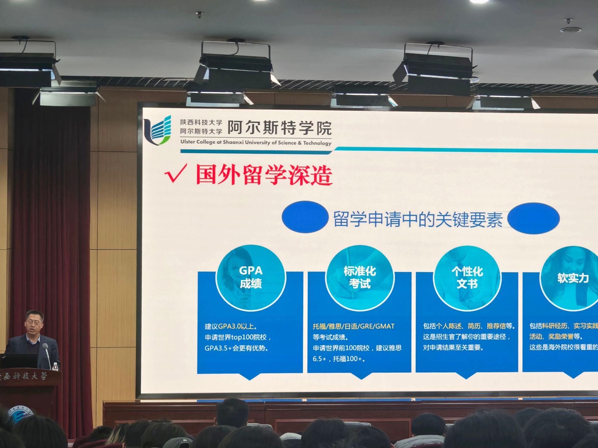 會(huì)上,薛朝華分別做《中外合作辦學(xué)學(xué)生生涯路徑規(guī)劃》《阿爾斯特學(xué)院中外合作辦學(xué)聯(lián)合培養(yǎng)模式對(duì)比》兩個(gè)報(bào)告。基于中外合作辦學(xué)學(xué)生特點(diǎn),結(jié)合學(xué)院五年來(lái)的辦學(xué)實(shí)際,他深入分析赴英聯(lián)合培養(yǎng)項(xiàng)目及“4+0”在地國(guó)際化培養(yǎng)的特點(diǎn)和優(yōu)勢(shì),并綜合學(xué)院學(xué)生整體發(fā)展路徑選擇及個(gè)體成長(zhǎng)案例要點(diǎn),以詳實(shí)的數(shù)據(jù)、細(xì)致的對(duì)比、生動(dòng)的個(gè)案為學(xué)生成長(zhǎng)謀策出招。