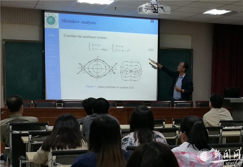 王震教授以氣象學(xué)中的“蝴蝶效應(yīng)”為引例,介紹了混沌動力學(xué)的發(fā)展過程,從李亞普諾夫指數(shù)的構(gòu)造、分支現(xiàn)象及混沌系統(tǒng)的兩大主要研究手段等方面介紹了其在混沌動力系統(tǒng)方面的研究成果,同時結(jié)合報告內(nèi)容向師生們介紹了自己的科研思路及對科研問題的思考方式。整場報告內(nèi)容豐富,參會師生與王教授進行了學(xué)術(shù)交流。