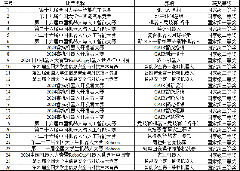 2024年,在學(xué)校教務(wù)處的大力指導(dǎo)下,我校師生在第十九屆全國大學(xué)生智能汽車競賽、第二十六屆中國機(jī)器人與人工智能大賽、2024??箼C(jī)器人開發(fā)者大賽、第二十六屆中國機(jī)器人與人工智能大賽、第二十三屆全國大學(xué)生機(jī)器人大賽(Robcon)、第21屆全國大學(xué)生信息安全與對(duì)抗技術(shù)競賽和2024中國機(jī)器人大賽暨RoboCup機(jī)器人世界杯中國賽中再創(chuàng)佳績,累計(jì)獲全國一等獎(jiǎng)4項(xiàng)、二等獎(jiǎng)8項(xiàng)、三等獎(jiǎng)14項(xiàng),省級(jí)獎(jiǎng)項(xiàng)39項(xiàng)。