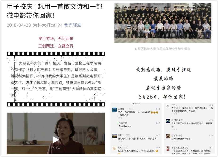 為深入貫徹落實(shí)學(xué)校思想政治工作會(huì)議精神,認(rèn)真做好60周年校慶相關(guān)工作,傳播和弘揚(yáng)“三創(chuàng)兩遷”精神,食品與生物工程學(xué)院依托教師隊(duì)伍和學(xué)院新媒體運(yùn)營(yíng)中心、食光網(wǎng)絡(luò)文化工作室、青年記者團(tuán)等學(xué)生組織,以“講述科大故事、訴說(shuō)科大情懷”為主題,以學(xué)校三個(gè)時(shí)期的建設(shè)為主線(xiàn),通過(guò)對(duì)老教師的深入采訪(fǎng),講述他們與科大相伴60年砥礪前行的動(dòng)人故事,展現(xiàn)科大人“西遷精神”,制作并發(fā)布了《科大時(shí)光機(jī)》校慶獻(xiàn)禮宣傳片,迅速引發(fā)了校友和在校生的點(diǎn)擊觀(guān)看,受到了廣泛好評(píng)。