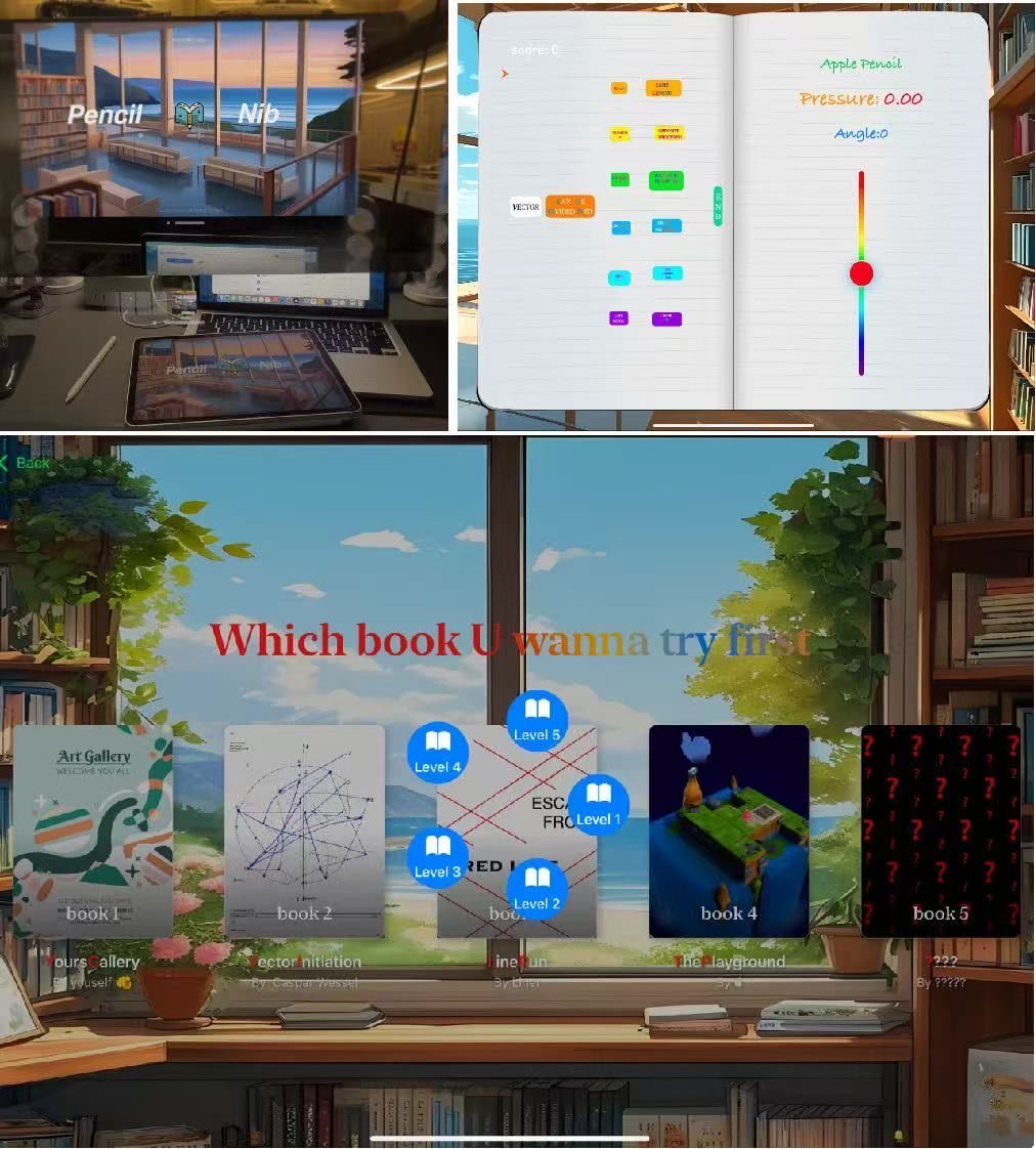 陸星宇此次作品 “Pencil nib”屬于一款壓感游戲,能夠幫助注意缺陷與多動(dòng)障礙(ADHD)患者集中注意力。ADHD是一種以注意力無法持久集中、過度活躍和情緒易沖動(dòng)為主癥的神經(jīng)發(fā)育障礙,常在兒童時(shí)期發(fā)病,多數(shù)在學(xué)齡前期開始出現(xiàn),主要分為兒童青少年ADHD和成人ADHD兩種類型。探索Apple pencil作為多元場景游戲手柄的潛力,讓玩家通過控制“ mini Pen ”來修復(fù)書本。運(yùn)用 SwiftUI 的 TabView 框架搭建了引導(dǎo)幻燈片,讓玩家快速掌握基礎(chǔ)操作;后半部分采用四格漫畫劇情,通過 Procreate、GoodNotes、醒圖以及 iPad OS 18 鎖屏繪制完成,增強(qiáng)玩家游玩興趣。第一本為空白繪本,基于SpriteKit設(shè)定主角物理屬性,UIKit構(gòu)建自適應(yīng)框架確保界面成比例,能讓玩家發(fā)揮想象力自由繪畫。第二本為向量知識(shí),通過SpriteKit定義節(jié)點(diǎn)與箭頭碰撞檢測(cè),觸發(fā)SwiftUI層來調(diào)用Apple Pencil震動(dòng)反饋。第三本為逃離紅線關(guān)卡,SpriteKit控制七個(gè)方向隨機(jī)生成的箭頭與紅線物理交互,使用SF Symbols素材做為出口,成功逃脫即通關(guān)。第四本為The Playground,采用一種MIT協(xié)議開源迷宮算法,SpriteKit實(shí)現(xiàn)Byte角色與寶石碰撞檢測(cè),迷宮中心寶石獲取后通關(guān)。
