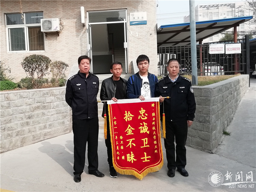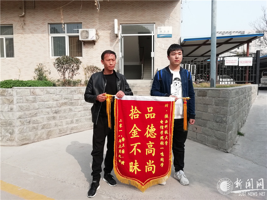 來(lái)自陜西榆林的徐衛(wèi)國(guó)先生3月12日一大早就趕到陜西科技大學(xué),分別將寫(xiě)有“拾金不昧,忠誠(chéng)衛(wèi)士”和“拾金不昧,品德高尚”的兩面錦旗,鄭重地送到學(xué)校保衛(wèi)處、電氣與信息工程學(xué)院大四學(xué)生張一鳴手中,以此表達(dá)他深深的謝意。