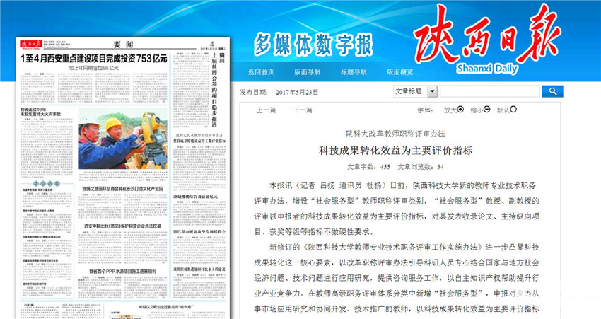 陜西日?qǐng)?bào)5月23日4版要聞以《科技成果轉(zhuǎn)化效益為主要評(píng)價(jià)指標(biāo)》為題,報(bào)道我校落實(shí)“陜九條”精神,改革教師職稱評(píng)審辦法,促進(jìn)科技成果就地轉(zhuǎn)化、助力陜西追趕超越。