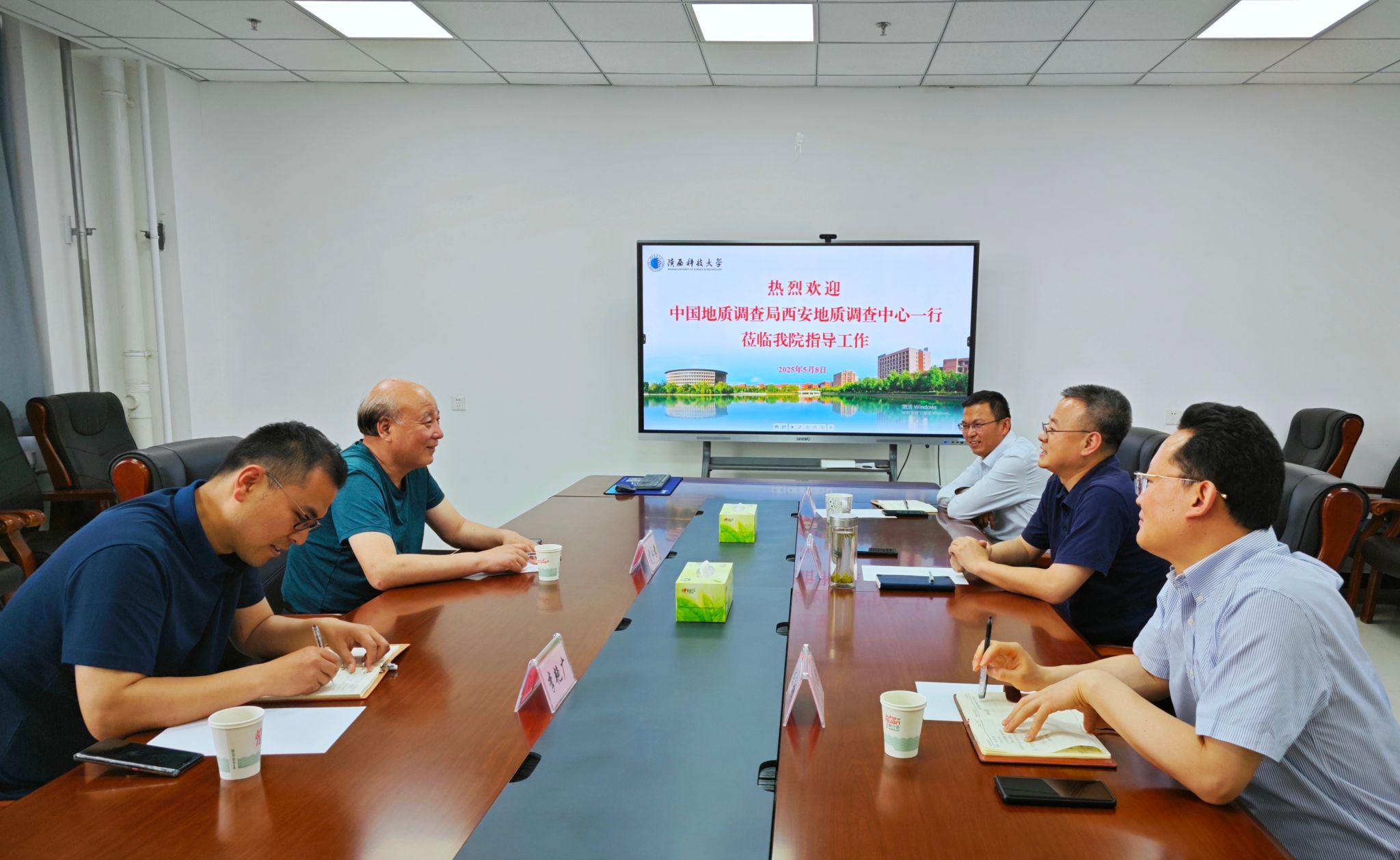 會(huì)上,郭軍康對雷永孝一行來訪表示熱烈歡迎,回顧了雙方在環(huán)境地質(zhì)領(lǐng)域的合作淵源,并從辦學(xué)歷史、學(xué)科專業(yè)建設(shè)、人才培養(yǎng)、科研隊(duì)伍體系、社會(huì)服務(wù)等方面介紹了學(xué)院基本情況,他希望雙方加強(qiáng)聯(lián)系,圍繞國家“一帶一路”倡議及區(qū)域經(jīng)濟(jì)發(fā)展需求,找準(zhǔn)學(xué)科交叉結(jié)合點(diǎn)構(gòu)建合作機(jī)制,充分發(fā)揮彼此優(yōu)勢通力協(xié)作,攜手為行業(yè)和地區(qū)發(fā)展作出新的貢獻(xiàn)。雷永孝主任介紹了中國地質(zhì)調(diào)查局西安地質(zhì)調(diào)查中心的歷史沿革、發(fā)展現(xiàn)狀、職能范圍等情況,分析了地礦行業(yè)的業(yè)務(wù)需求,他表示,環(huán)境學(xué)院近年來快速發(fā)展所取得的成績令人矚目,希望通過加強(qiáng)全方面合作,實(shí)現(xiàn)資源互享、優(yōu)勢互補(bǔ)、互利共贏,特別指出基于中國上海合作組織地學(xué)合作研究中心平臺,可以為我校開展與中亞國家在環(huán)境地學(xué)科學(xué)研究、技術(shù)服務(wù)等多方面的合作提供橋梁紐帶。