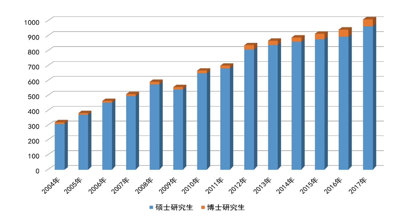 研究生招生規(guī)模不斷擴大,自2004年開始博士研究生招生以來,研究生招生數(shù)量增長超過三倍,2017年碩士研究生招生達到932人,博士研究生招生52人,目前各類在校全日制研究生2821名;同時,形成了“本碩博”一體化的創(chuàng)新型人才選拔機制,通過實施碩士研究生“優(yōu)秀生源計劃”、推免生“4+2”學(xué)制,博士研究生“碩博連讀”和“申請-考核”制,2017年推免生和碩士研究生本校生源率分別達到97.45%和53.04%,全日制非定向博士研究生比例連年增長,生源質(zhì)量顯著提高。