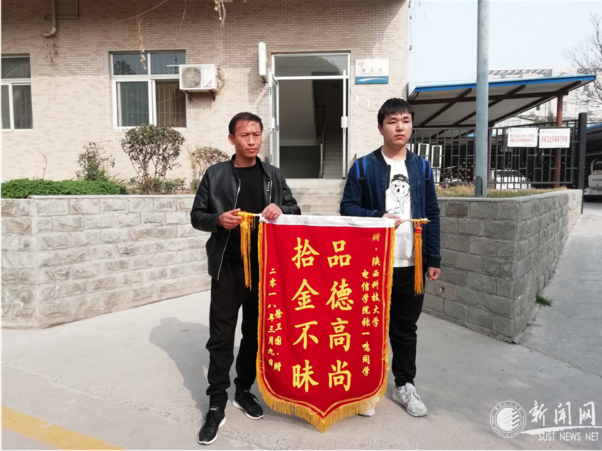 來(lái)自陜西榆林的徐衛(wèi)國(guó)先生3月12日一大早就趕到陜西科技大學(xué),分別將寫有“拾金不昧,忠誠(chéng)衛(wèi)士”和“拾金不昧,品德高尚”的兩面錦旗,鄭重地送到學(xué)校保衛(wèi)處、電氣與信息工程學(xué)院大四學(xué)生張一鳴手中,以此表達(dá)他深深的謝意。3月5日晚上10點(diǎn)左右,張一鳴同學(xué)在杜家堡十字路口撿到一個(gè)紅色塑料袋,發(fā)現(xiàn)內(nèi)有錢包一個(gè)、現(xiàn)金一萬(wàn)余元、銀行卡若干和身份證。他將物品交至校保衛(wèi)處。經(jīng)學(xué)校保衛(wèi)處努力,于3月8日成功聯(lián)系上失主徐衛(wèi)國(guó)。