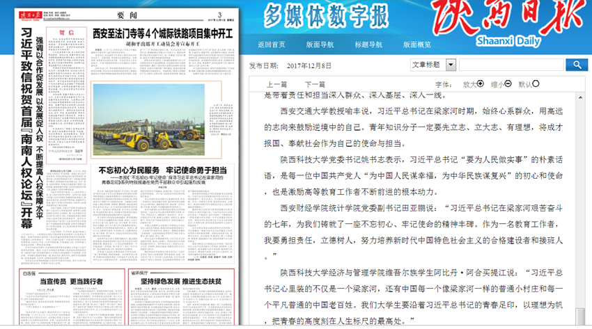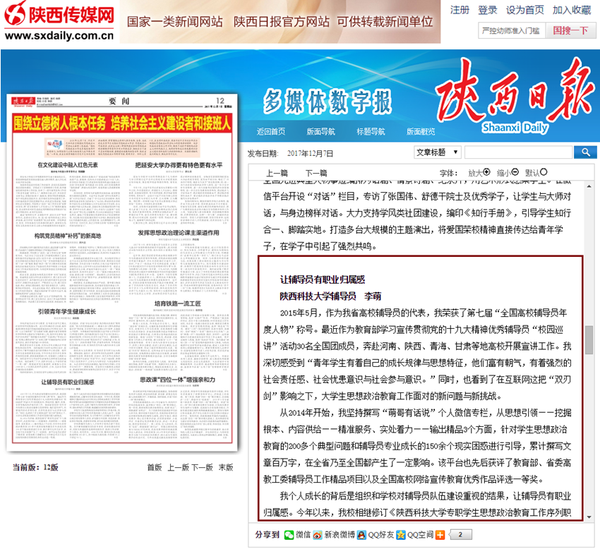 12月8日發(fā)行的《陜西日?qǐng)?bào)》3版要聞刊登了《“探尋習(xí)近平總書記在梁家河的青春足印”系列特別報(bào)道引起強(qiáng)烈反響》,其中報(bào)道我校師生觀文后從中汲取力量、不忘初心、牢記使命勇于擔(dān)當(dāng)?shù)那袑?shí)感悟和為實(shí)現(xiàn)中華民族偉大復(fù)興的中國(guó)夢(mèng)和陜西追趕超越貢獻(xiàn)自己力量的踐行意愿。