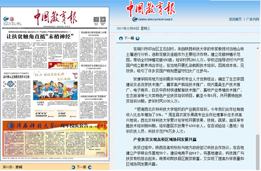 12月6日,《中國(guó)教育報(bào)》在頭版頭條刊發(fā)的報(bào)道《陜西百所高校幫扶百縣,通過走村入戶、產(chǎn)業(yè)培訓(xùn)、產(chǎn)學(xué)研協(xié)同開展深度扶貧——讓扶貧觸角直抵“末梢神經(jīng)”》中,報(bào)道了我校在銅川市印臺(tái)區(qū)王石凹村,通過開展多種形式的特色產(chǎn)業(yè)培訓(xùn),增強(qiáng)貧困地區(qū)的“造血”功能。