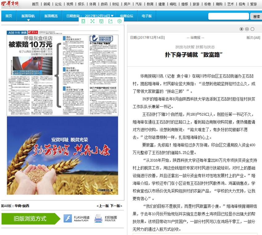 12月14日,《華商報(bào)》報(bào)道了我校駐村扶貧干部姬海鋒任王石凹村駐村扶貧工作隊(duì)隊(duì)長(zhǎng)兼第一書記以來——撲下身子鋪就“致富路”的新聞。