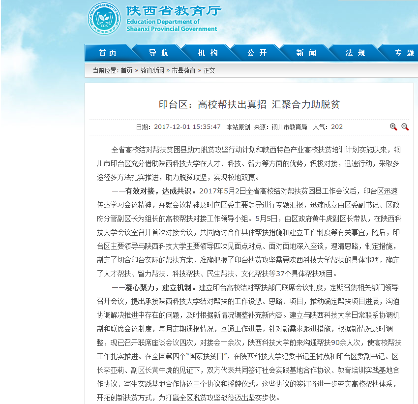 12月1日,陜西省教育廳門戶網(wǎng)站在“教育新聞”的《印臺(tái)區(qū):高校幫扶出真招 匯聚合力助脫貧》報(bào)道中,報(bào)道了我校充分發(fā)揮人才、科技、智力等方面的優(yōu)勢(shì),積極對(duì)接,迅速行動(dòng),采取多途徑多方法扎實(shí)推進(jìn),助力銅川市印臺(tái)區(qū)脫貧攻堅(jiān),實(shí)現(xiàn)校地雙贏。