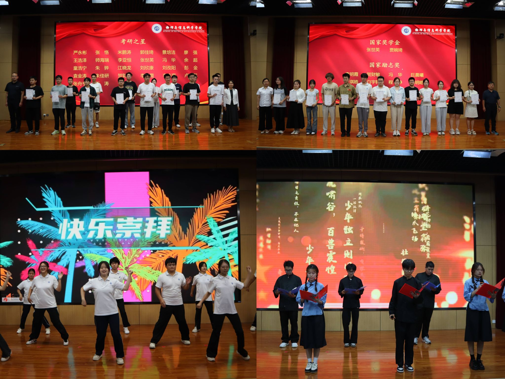 表彰大會(huì)以“青春逐夢(mèng)、榮耀同行”為主題,通過(guò)四個(gè)篇章,生動(dòng)展現(xiàn)了物理學(xué)子在青春賽道上奮勇拼搏的精彩畫卷。第一篇章“揚(yáng)帆起航——做敢想敢為的新青年”,表彰了在閱讀、文藝、體育等方面表現(xiàn)突出的同學(xué),“閱讀之星”“文藝之星”“體育之星”等榮譽(yù),詮釋了青春的無(wú)限可能。第二篇章“勤學(xué)善思——做只爭(zhēng)朝夕的新青年”,表彰了在班團(tuán)建設(shè)等方面表現(xiàn)突出的集體,“先進(jìn)團(tuán)支部”“優(yōu)秀班集體”“優(yōu)秀宿舍”等榮譽(yù),彰顯了團(tuán)隊(duì)協(xié)作的強(qiáng)大凝聚力;第三篇章“奮楫篤行——做追光逐電的新青年”,表彰了在學(xué)業(yè)和科技創(chuàng)新方面獲“國(guó)家獎(jiǎng)學(xué)金”“優(yōu)秀科創(chuàng)獎(jiǎng)”的同學(xué),他們是科研創(chuàng)新的排頭兵。第四篇章“長(zhǎng)風(fēng)萬(wàn)里——做志存高遠(yuǎn)的新青年”,表彰了畢業(yè)生在考研、就業(yè)和學(xué)生工作等方面取得的成績(jī),“考研之星”“就業(yè)之星”“優(yōu)秀畢業(yè)生”“優(yōu)秀畢業(yè)生學(xué)生干部”等榮譽(yù),是對(duì)他們大學(xué)時(shí)光努力的最好肯定。