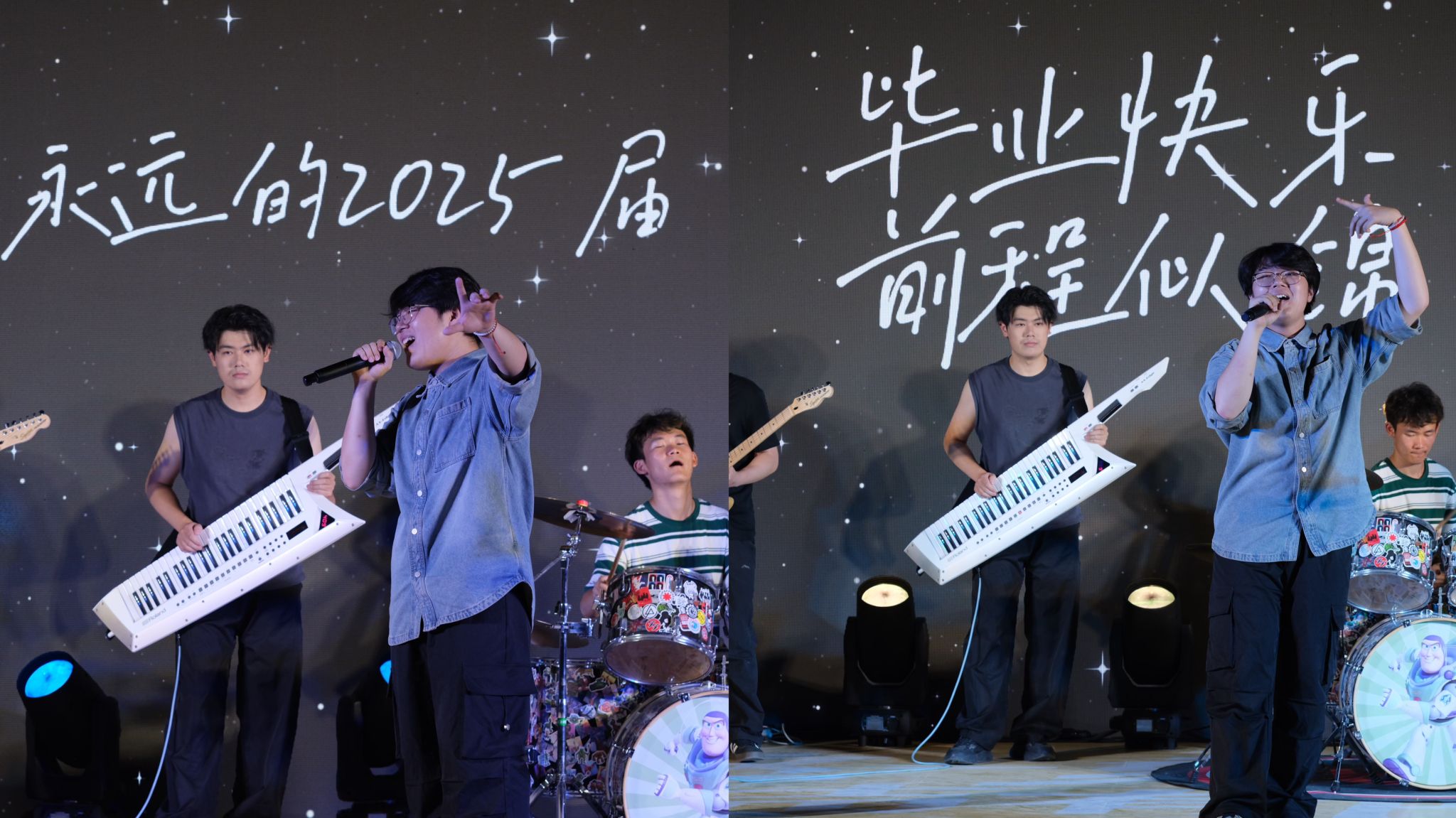 晚會(huì)以“青春印記”“青春路途”“青春永恒”三個(gè)篇章徐徐展開。舞臺(tái)之上,當(dāng)方向標(biāo)樂隊(duì)奏響《你要跳舞嗎》的第一個(gè)音符,整個(gè)夏夜瞬間被點(diǎn)燃?!镀呃锵恪贰洞掖夷悄辍返母柙~被學(xué)子們輕聲跟唱,閃爍的手機(jī)燈光如星河傾瀉,串聯(lián)起校園歲月的珍貴片段;當(dāng)《我們的明天》的旋律在夜空下回蕩,所有的離別都化作期許,青春的故事永不落幕,我們的篇章終將繼續(xù)書寫;《總有一天你會(huì)出現(xiàn)在我的身邊》,那些未曾說出口的告白在音符間靜靜流淌。舞臺(tái)之下,此起彼伏的“人浪”與歡呼聲交織成夏夜最動(dòng)人的和聲,仿佛要把這最后的相聚時(shí)光永遠(yuǎn)鐫刻在記憶里。