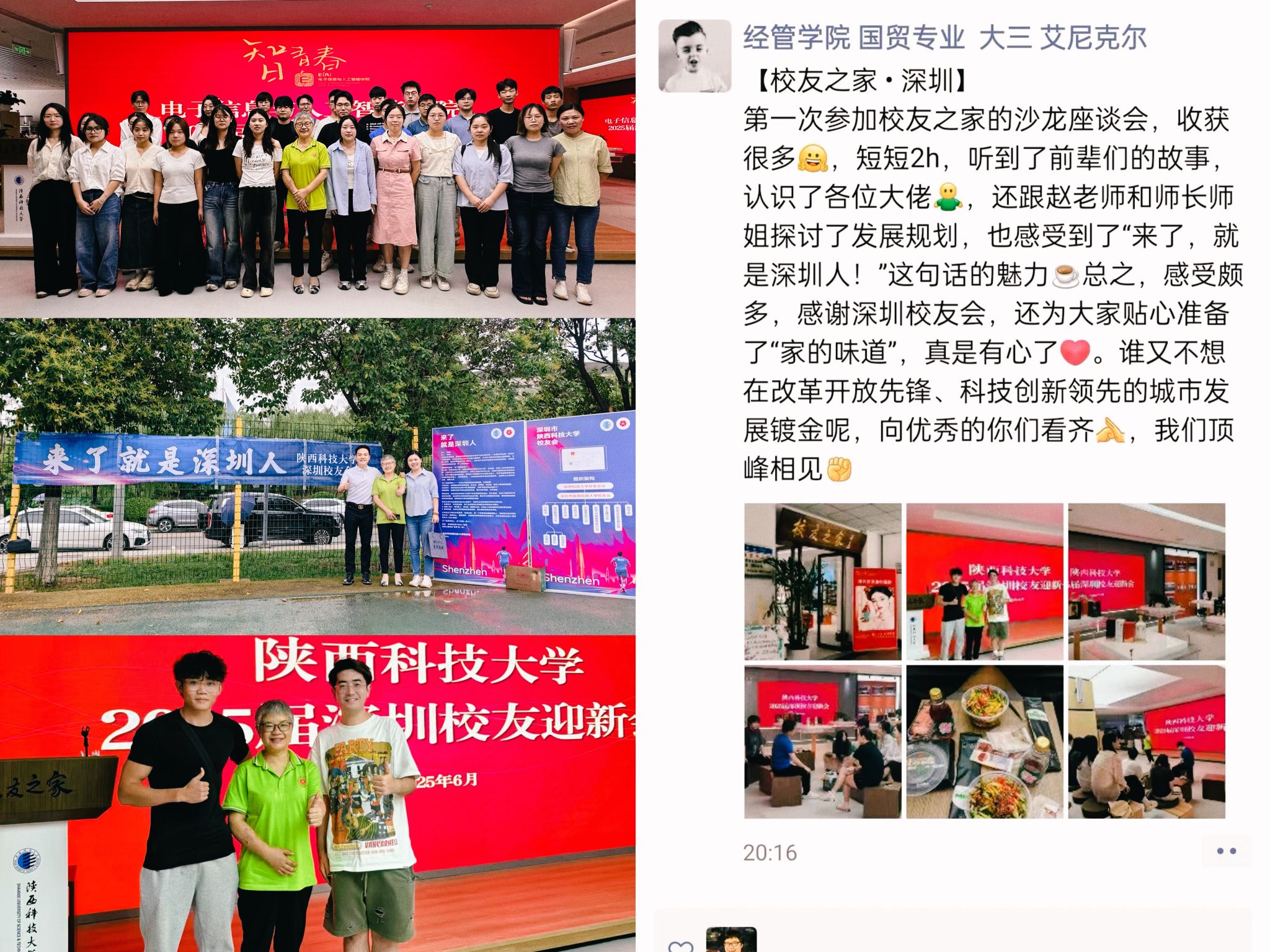 恰逢陜西科技大學(xué)2025屆畢業(yè)典禮,深圳校友會(huì)推出“深愛校友·灣區(qū)啟航——來了就是深圳人”系列活動(dòng),將迎新活動(dòng)前置到畢業(yè)現(xiàn)場(chǎng)。通過畢業(yè)生座談會(huì)、典禮擺攤迎新、線上社群對(duì)接等方式,提前與應(yīng)屆畢業(yè)生建立緊密聯(lián)系。6月23日,三場(chǎng)迎新溝通座談會(huì)在“校友之家”舉行,校黨委副書記李學(xué)軍、學(xué)工部、校友總會(huì)、電智學(xué)院與深圳校友會(huì)骨干成員、畢業(yè)生及在校生代表齊聚一堂。校友們分享自身經(jīng)歷,介紹深圳產(chǎn)業(yè)環(huán)境、人才政策與校友資源網(wǎng)絡(luò),還為同學(xué)們送上玫瑰醋飲料和“三秦套餐”,讓畢業(yè)生尚未抵達(dá)深圳,便找到了“組織”,堅(jiān)定了南下就業(yè)的決心。