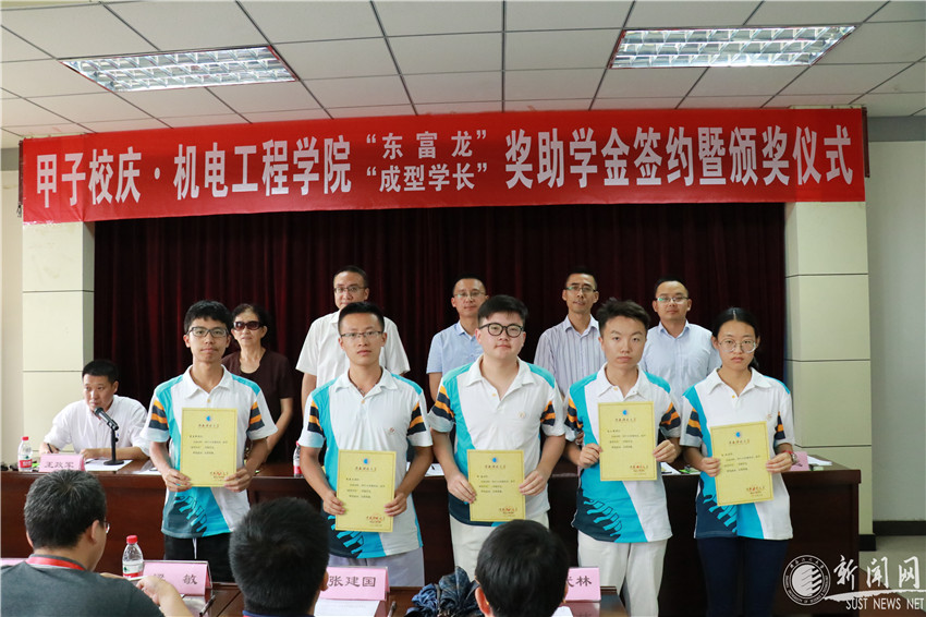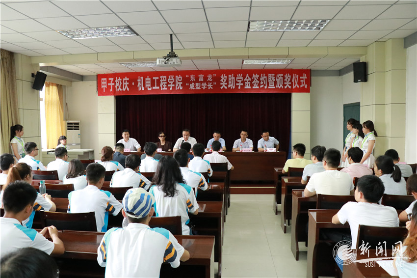 6月26日,在甲子校慶之日,“東富龍”、“成型學(xué)長”獎助學(xué)金頒獎儀式暨校企合作簽約儀式在機電工程學(xué)院圓滿舉辦。上海東富龍科技股份有限公司人力資源部經(jīng)理顧為祥,成型專業(yè)002班班主任王玉茹及校友代表梁敏、張建國、李武林,機電學(xué)院負責(zé)人和獲獎學(xué)生及師生代表參加。大會由學(xué)院院長助理王政軍主持。