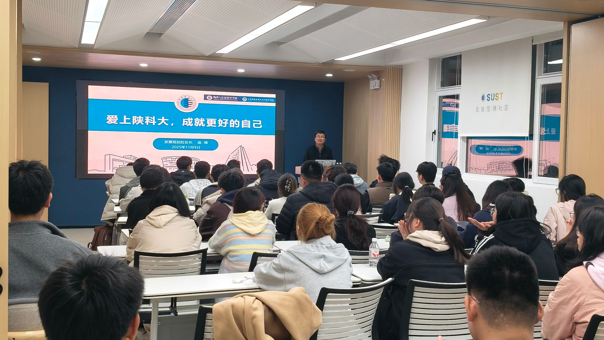 11月9日,發(fā)展規(guī)劃處處長龐博以《愛上陜科大,成就更好的自己》為題,為文化與教育學院、物理與信息科學學院2025級新生帶來一場別開生面、內(nèi)涵豐富的思政課。