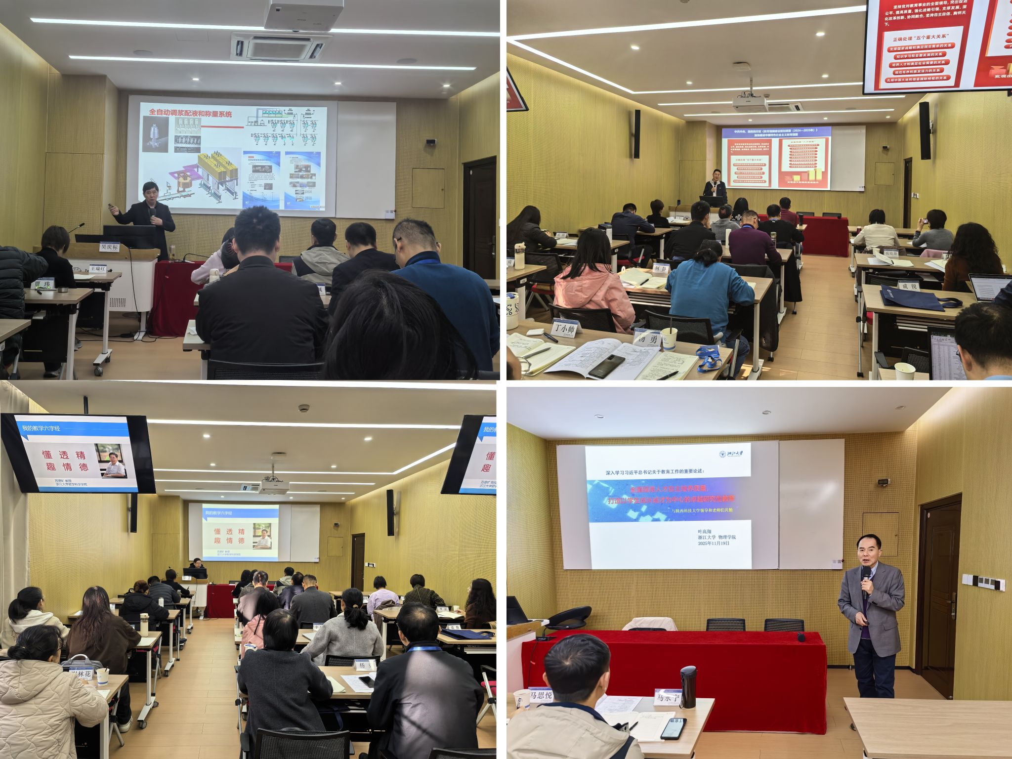 本次研修課程體系設(shè)計(jì)科學(xué)、內(nèi)容前沿,全面覆蓋教育教學(xué)改革與人才隊(duì)伍建設(shè)、研究生培養(yǎng)、智能制造前沿技術(shù)、學(xué)科專業(yè)建設(shè)發(fā)展、科研能力提升等核心模塊。浙江大學(xué)化學(xué)系林旭鋒教授以化學(xué)“雙一流”學(xué)科建設(shè)為典型案例,系統(tǒng)闡釋了從頂層設(shè)計(jì)到實(shí)踐路徑的完整經(jīng)驗(yàn),為我校相關(guān)學(xué)科的內(nèi)涵建設(shè)與創(chuàng)新發(fā)展提供了重要參考。面對(duì)人工智能的時(shí)代浪潮,課程特邀專家對(duì)DeepSeek等大模型的技術(shù)演進(jìn)及其教育應(yīng)用場(chǎng)景進(jìn)行了深入剖析,有效激發(fā)了參訓(xùn)教師對(duì)智能技術(shù)賦能教學(xué)改革與科研創(chuàng)新的深層思考。在教學(xué)藝術(shù)錘煉方面,數(shù)學(xué)科學(xué)學(xué)院蘇德礦老師提出的“懂、透、精、趣、情、德”教學(xué)六字經(jīng),以及物理學(xué)院葉高翔教授、中國(guó)科教戰(zhàn)略研究院張煒教授圍繞“以學(xué)生為中心”的卓越教育體系構(gòu)建、研究生培養(yǎng)質(zhì)量提升等所作的專題報(bào)告,從教育理念到實(shí)踐方法層面,全面啟發(fā)了教師對(duì)育人本質(zhì)的重新審視與觀念更新。此外,其他多場(chǎng)專題報(bào)告同樣見解深刻、內(nèi)容充實(shí),引發(fā)了參訓(xùn)教師的廣泛共鳴與深入思考。