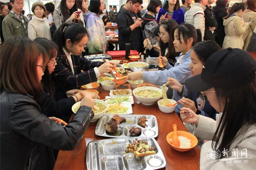 美食節(jié)上我校張征、梁小龍兩位廚師烹制的臊子面一經推出,大受歡迎,師生們在我校交流窗口排起了四百多米長的隊伍,迫不及待地品嘗湯鮮味美的關中臊子面,一碗碗“薄、筋、光,煎、稀、汪,酸、辣、香”的臊子面讓江南大學師生豎起大拇指,許多同學在品嘗后表示:“臊子面酸辣鮮香,筋道彈牙,頗具西北風味,為師生的餐桌增添了一道亮麗的風景線,像這樣的伙食交流很棒!”兩位師傅還在現場為師生展示扯面技能,引來師生陣陣歡呼。