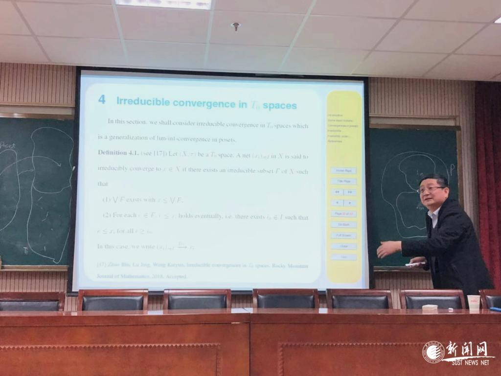 11月22日,應(yīng)文理學(xué)院邀請(qǐng),西安交通大學(xué)數(shù)學(xué)與統(tǒng)計(jì)學(xué)院院長趙彬教授在我校理科樓文理學(xué)院學(xué)術(shù)報(bào)告廳作了題為“ Two types of convergences in T0 topological spaces”的學(xué)術(shù)報(bào)告。報(bào)告會(huì)由文理學(xué)院院長藺小林主持,數(shù)學(xué)系部分教師和研究生參加了報(bào)告會(huì)。