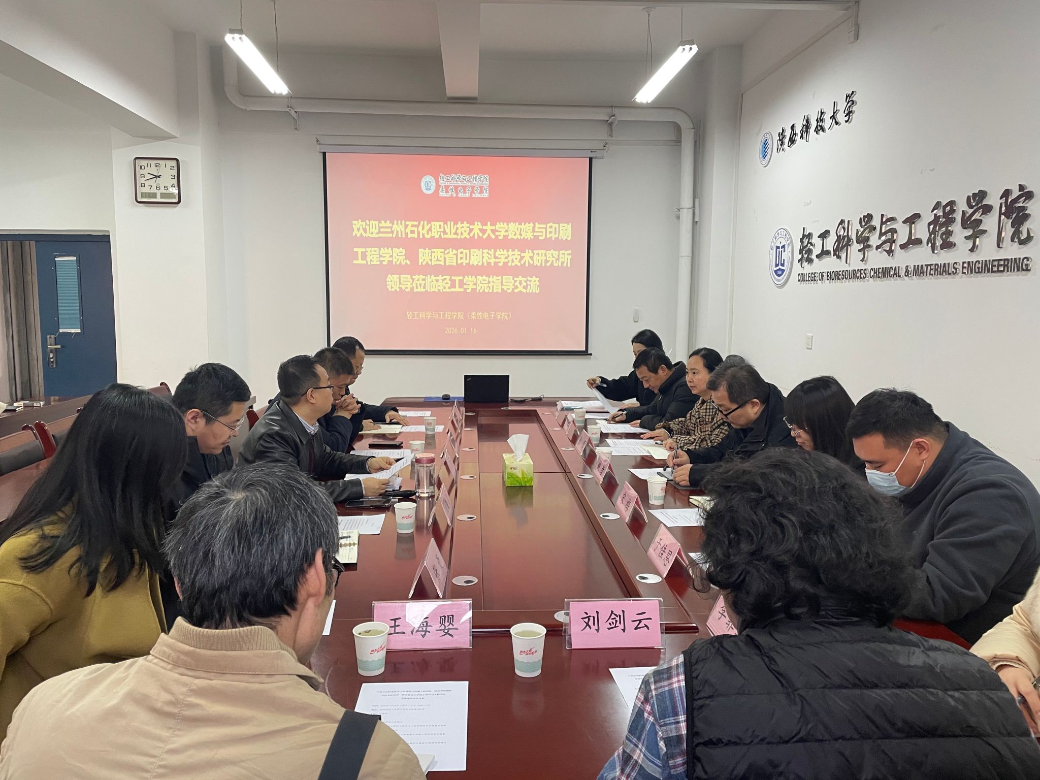 1月16日,蘭州石化職業(yè)技術(shù)大學(xué)數(shù)媒與印刷工程學(xué)院院長(zhǎng)鮑蓉、副院長(zhǎng)張治軍、辦公室主任陸菲、教研室主任李菲菲、劉劍云,陜西省印刷科學(xué)技術(shù)研究所副所長(zhǎng)姚哲、產(chǎn)業(yè)發(fā)展部部長(zhǎng)宋梅、科技發(fā)展部部長(zhǎng)于佳恩等一行,來輕工科學(xué)與工程學(xué)院進(jìn)行交流。輕工學(xué)院院長(zhǎng)呂斌、副院長(zhǎng)劉國(guó)棟、新媒體系副主任劉曉晨、李國(guó)志、張曼等參加座談。會(huì)議由劉國(guó)棟主持。