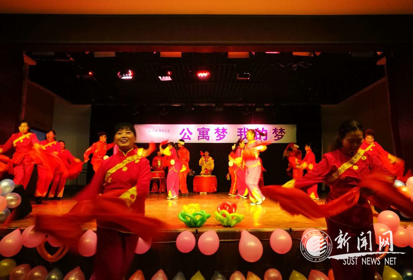 晚會以“公寓夢·我的夢”為主題,在管理員和自管會同學(xué)共同精心編排的腰鼓表演中拉開序幕?!吨袊鴫簟贰ⅰ讹w揚(yáng)的鼓聲》、《開開心心每一天》、《天上的西藏》等舞蹈,展示了公寓員工們昂揚(yáng)向上的精神面貌,三句半《贊科大發(fā)展》獲得在場觀眾掌聲陣陣,詩朗誦《珍惜工作,服務(wù)同學(xué)》更是將晚會掀起高潮,公寓阿姨們用樸素的言語道出了她們與學(xué)生之間化不開的親情與友情。