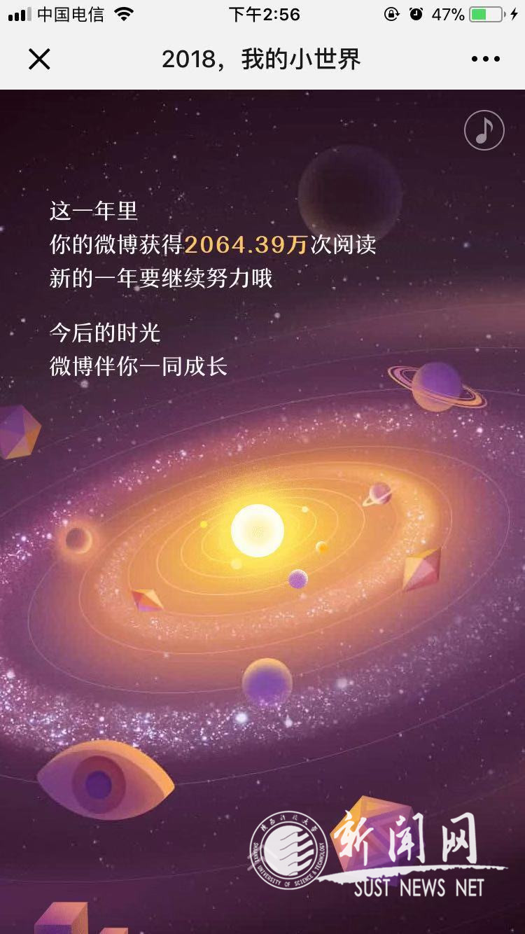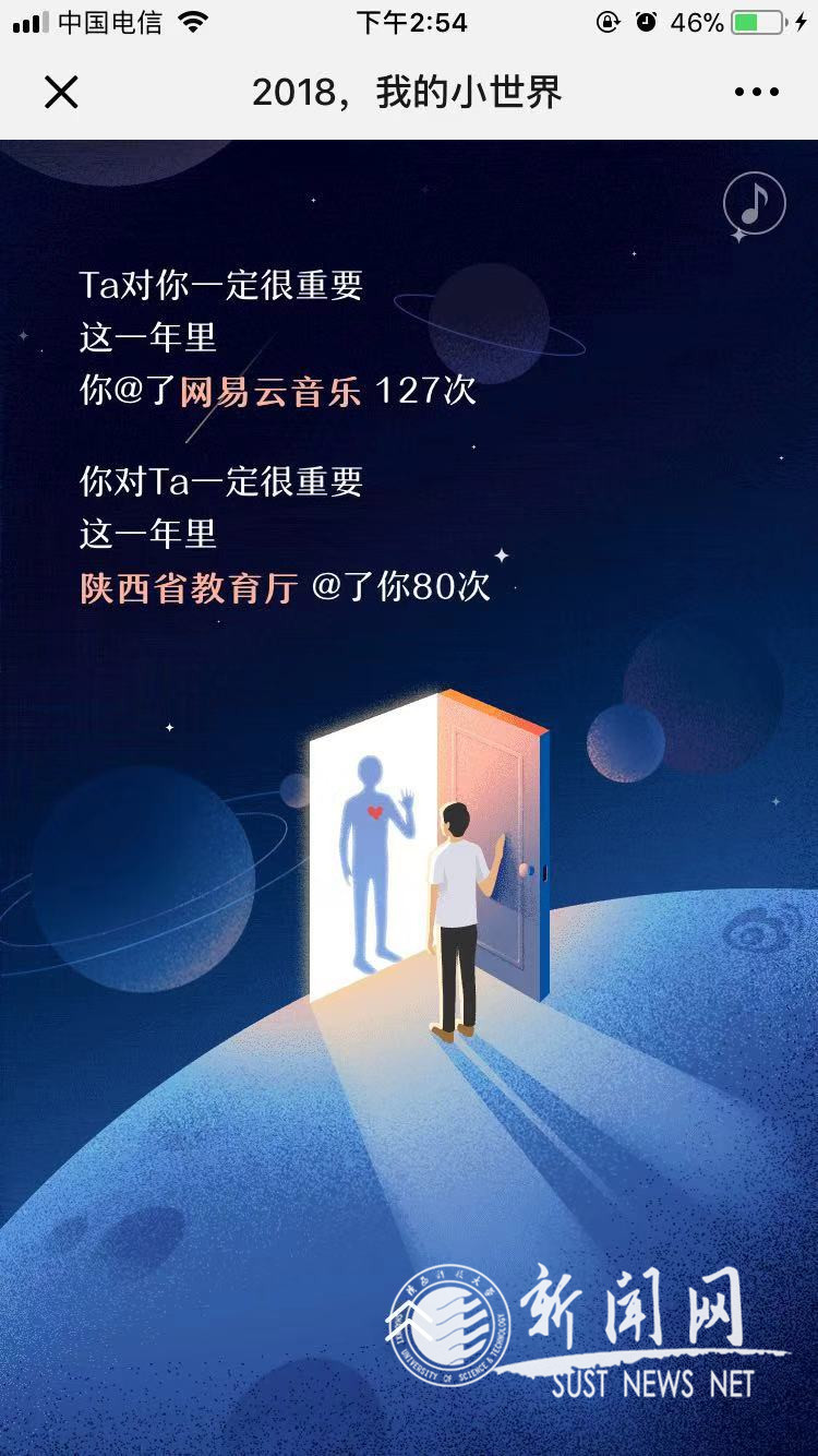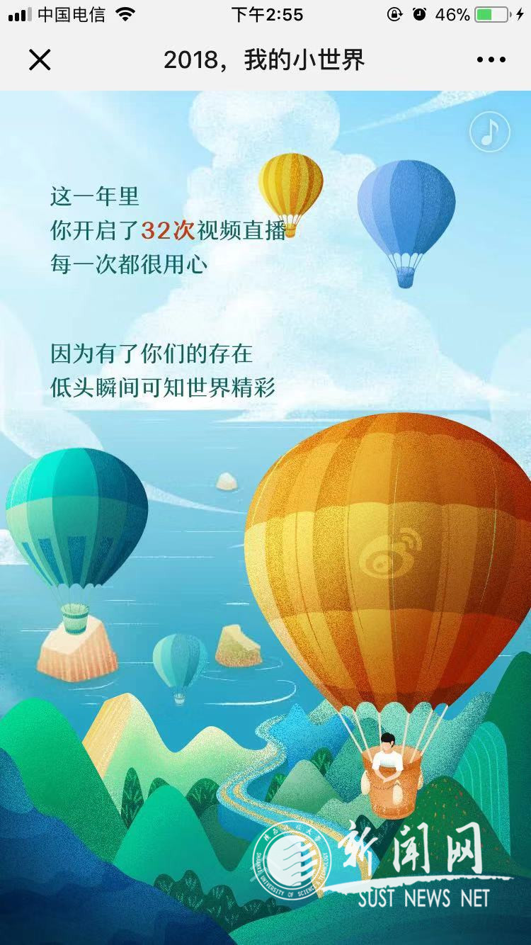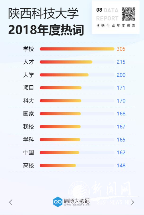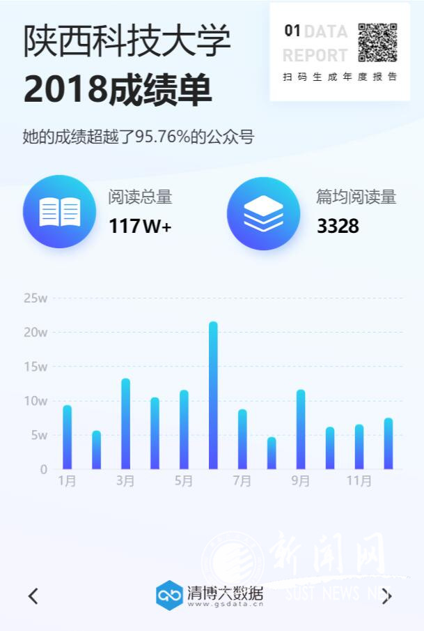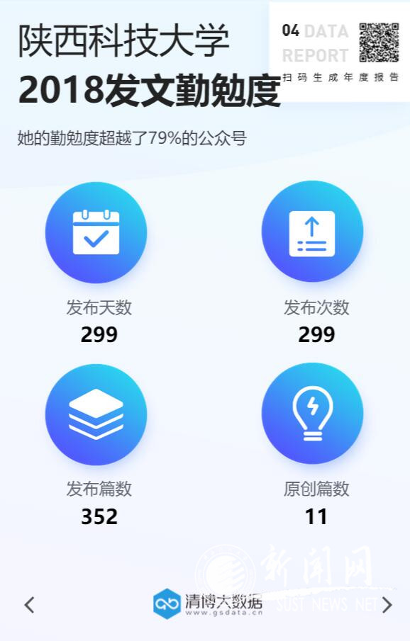 數(shù)據(jù)顯示。微信平臺以117萬總閱讀量,3328篇均閱讀量的總成績超越了95.76%公眾號,其傳播指數(shù)WCI 812.78超越了96%的公眾號。2018年微信共發(fā)布299天,推送352篇圖文,收獲2萬+個點贊,勤勉度超越了79%的公眾號。其中《甲子校慶丨陜西科技大學(xué)宣傳片、畫冊、大事記震撼首發(fā)》以當(dāng)周4萬+閱讀數(shù)榮登最熱文章,“人才”、“項目”、“學(xué)科”等詞匯被評為我校年度熱詞。
