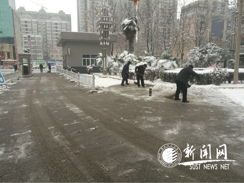 此次管委會共有20余人參加掃雪鏟冰工作。截止上午9點,咸陽校區(qū)管委會的部分職工仍奮戰(zhàn)在掃雪第一線……