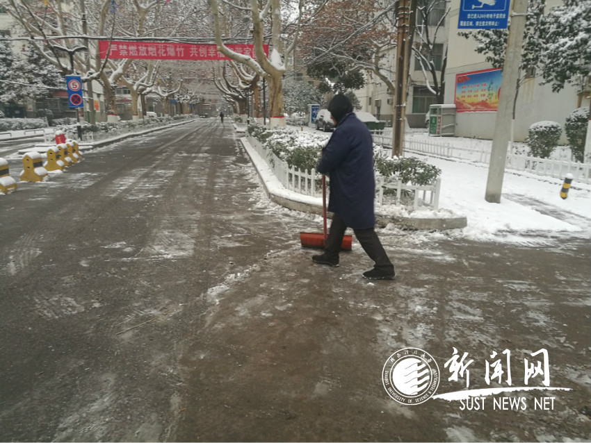 2月10日上午6:30,咸陽校區(qū)職工們不畏嚴寒,揮舞著掃把、鐵锨開始對校區(qū)路上的積雪和結冰進行清掃。大家齊心協(xié)力,配合默契,鏟的鏟、推的推、掃的掃,干得熱火朝天、不亦樂乎,忙碌的身影構成了一道亮麗的風景線。雖然室外溫度很低,但大家勞動的熱情和團結的力量讓這個冬日上午變得格外溫暖。