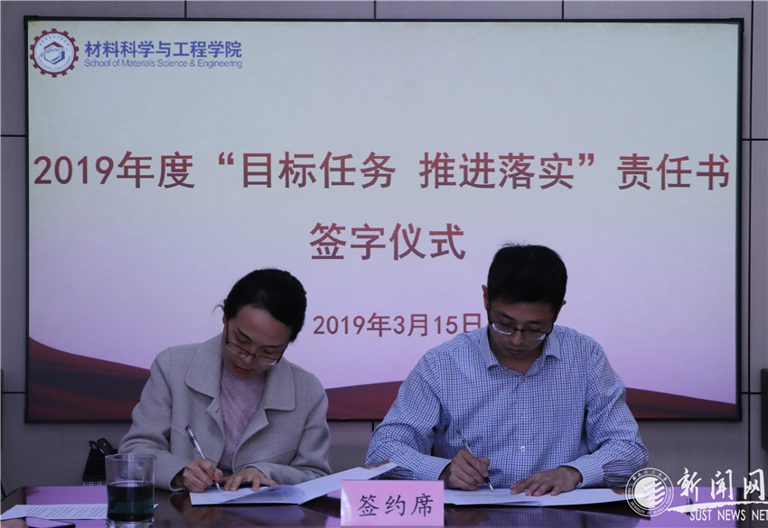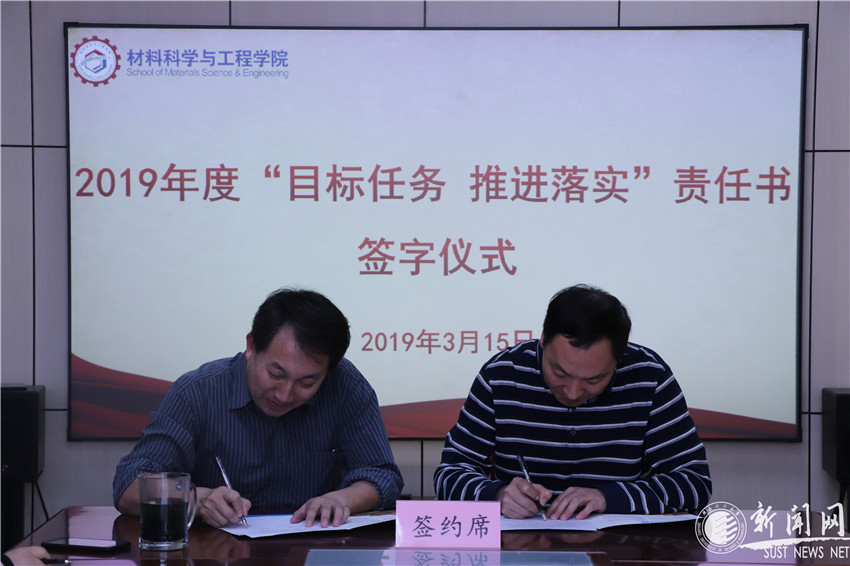 為進一步把學院2019年度各項重點任務落實到團隊、落實到個人,近日,材料科學與工程學院舉行 “目標任務推進落實”責任書簽字儀式。學院班子成員,各系(室)主任、副主任,教工黨支部書記,各科研團隊負責人(團長)參加,儀式由學院黨委副書記楊長安主持。