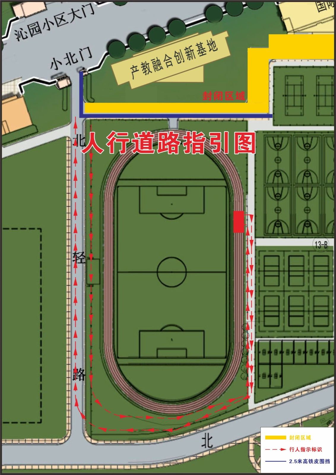 封閉期間,進(jìn)出田徑場需臨時繞行至球場東入口,從封閉口西端前往餐廳需經(jīng)北輕路、北環(huán)路臨時繞行第二田徑場東側(cè)道路。