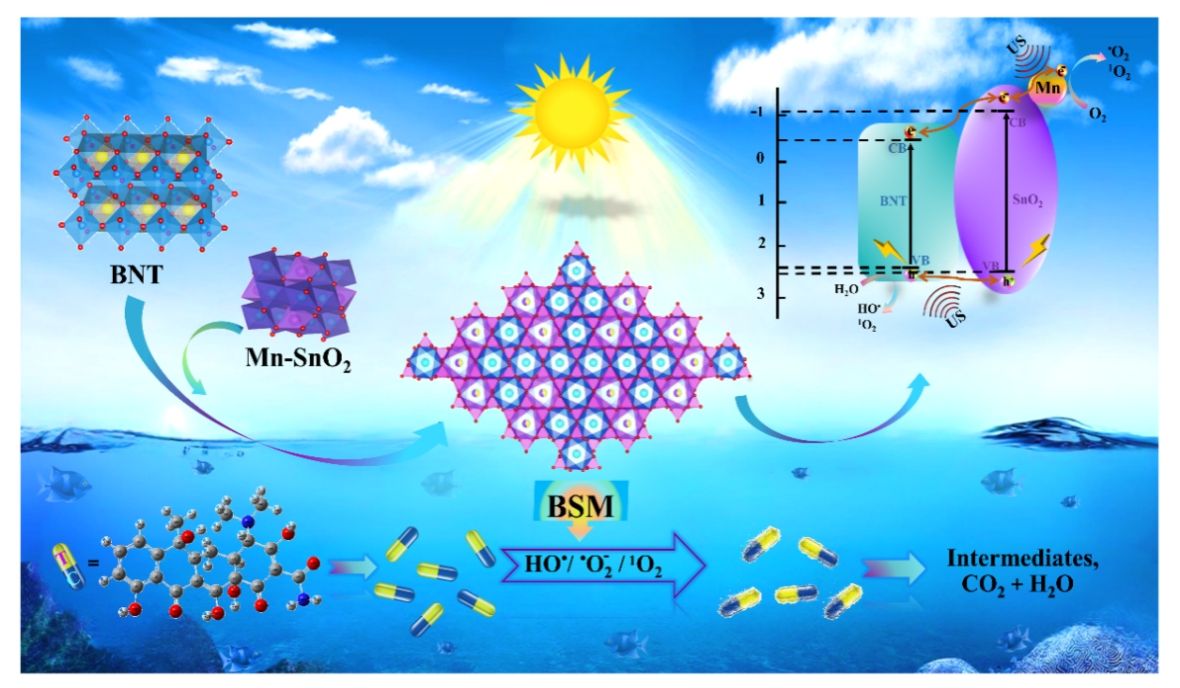 近年來(lái),壓電光催化技術(shù)作為一種新興的污染治理方法,因其能夠在外部應(yīng)力作用下促進(jìn)光催化反應(yīng)而受到廣泛關(guān)注。在這一領(lǐng)域中,鉍基復(fù)合氧化物由于其獨(dú)特的壓電特性和良好的可見(jiàn)光響應(yīng)性,引起了研究人員的廣泛興趣。然而,盡管該類材料在催化降解中的潛力巨大,但其不同形態(tài)和結(jié)構(gòu)的優(yōu)化仍是提升催化性能的關(guān)鍵問(wèn)題。針對(duì)這一挑戰(zhàn),研究發(fā)展了一種BNT@Mn-SnO2(BSM)異質(zhì)復(fù)合材料的合成方法,該材料結(jié)合了Bi0.5Na0.5TiO3(BNT)、錳納米粒子和SnO2。通過(guò)超聲波與可見(jiàn)光聯(lián)合照射,成功地在60分鐘內(nèi)實(shí)現(xiàn)了四環(huán)素(TC)的95.4%降解,顯著優(yōu)于傳統(tǒng)催化方法。BNT的固有電場(chǎng)與錳納米粒子的等離子體特性有效促進(jìn)了電荷的分離和傳輸,進(jìn)一步拓寬了光的吸收范圍,從而提高了光催化反應(yīng)的效率。該研究為提高抗生素降解效率提供了新的思路,并為開(kāi)發(fā)更高效的廢水處理技術(shù)奠定了基礎(chǔ)。