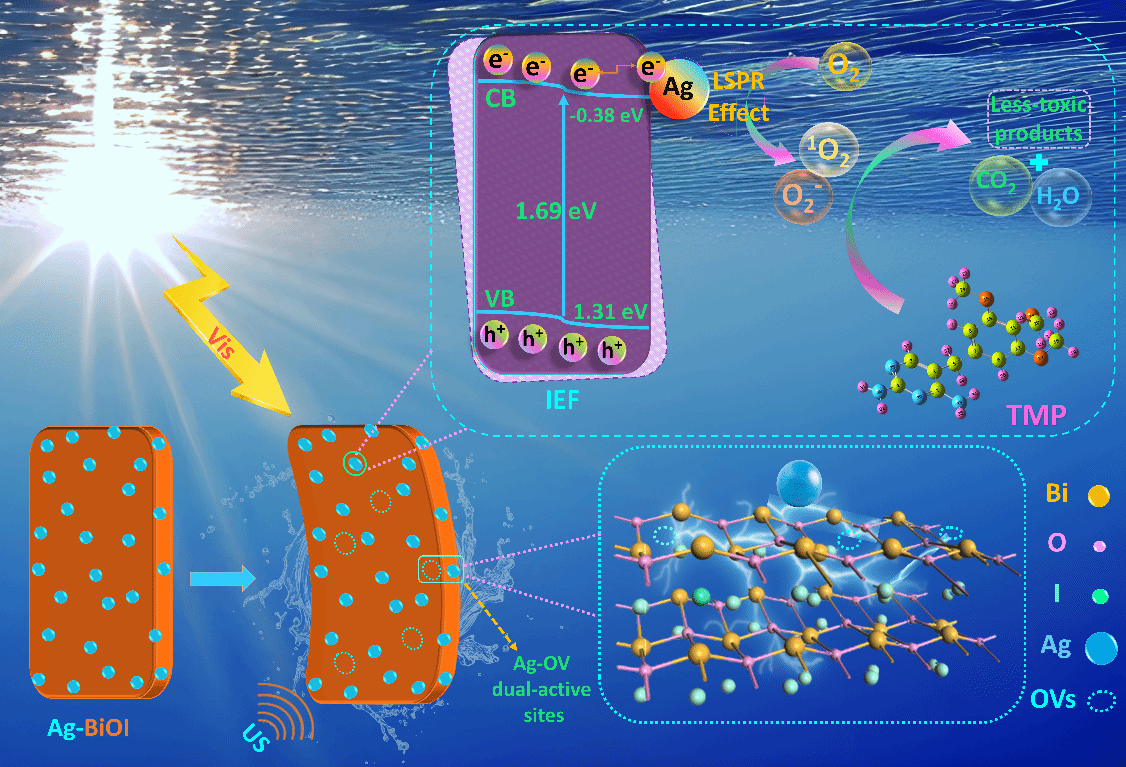 此外,利用銀負(fù)載鉍碘化物(Ag-BiOI)納米片提升三甲氧芐氨(TMP)降解性能。通過(guò)引入氧空位(OVs)和銀,顯著提高了催化劑的活性,60分鐘內(nèi)降解效率達(dá)到了97%。這一結(jié)果表明,氧空位和銀作為雙重活性位點(diǎn)在氧化自由基的生成中發(fā)揮了關(guān)鍵作用,從而促進(jìn)了TMP的高效降解。進(jìn)一步的研究評(píng)估了所合成的鉍基復(fù)合材料在實(shí)際廢水中的應(yīng)用效果。實(shí)驗(yàn)結(jié)果顯示,該材料在實(shí)際廢水中的催化降解性能顯著,表明其在復(fù)雜藥品廢水處理中的潛力。通過(guò)優(yōu)化催化劑濃度和反應(yīng)溫度等關(guān)鍵參數(shù),顯著提高了廢水中污染物的去除效率,為實(shí)際應(yīng)用中的抗生素污染治理提供了有效的技術(shù)支持。