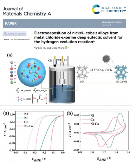 [2] Hu, Y.; Wang, C. Electrodeposition of nickel cobalt alloys from metal chloride-L-serine deep eutectic solvent for hydrogen evolution reaction. Journal of Materials Chemistry A. 2024, 12 (27): 16769-16779. https://doi.org/10.1039/D4TA02433H