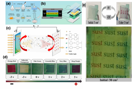 【工作4】:通過聚苯胺電極和合成的1-甲基-4,4’-聯吡啶碘化物(MBI)的互補結構,制備了多色電致變色器件。不僅能簡化器件結構,同時增強器件的色彩豐富性(呈現紅、黃、綠、藍、紫的寬色域)。利用絲網印刷技術制備的光調制顯示器件,可以實現圖案的顯示和隱藏。該器件可應用于智能窗、防偽和智能包裝等領域。