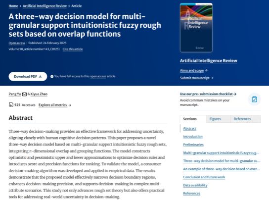 近日,數(shù)學學院于鵬副教授團隊在人工智能決策方面取得研究進展。其團隊最新研究成果 “A three-way decision model for multi-granular support intuitionistic fuzzy rough sets based on overlap functions” 已在人工智能領域國際權威期刊 Artificial Intelligence Review 正式發(fā)表。該論文由于鵬副教授和碩士生趙西月共同完成,趙西月為學生第一作者,于鵬副教授擔任通訊作者,陜西科技大學為論文第一通訊單位。