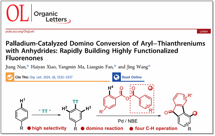 Catellani反應(yīng)被廣泛視為一種構(gòu)建復(fù)雜有機分子的強大手段,并因此引發(fā)了持續(xù)的關(guān)注與研究。與此同時,作為一類新興的親電偶聯(lián)試劑,芳基噻蒽鹽(aryl-TTs)亦在近年來吸引了眾多學(xué)者的密切關(guān)注。南江教授團隊發(fā)展了一種鈀催化的芳基噻蒽鹽與酸酐多米諾環(huán)化反應(yīng)新策略,可高效構(gòu)建一系列高度官能團化的芴酮,首次揭示了芳基噻蒽鹽作為偶聯(lián)試劑的多米諾環(huán)化反應(yīng)模式,拓展了其反應(yīng)類型。該工作以“Palladium-Catalyzed Domino Conversion of Aryl?Thianthreniums with Anhydrides: Rapidly Building Highly Functionalized Fluorenones”為題發(fā)表在有機化學(xué)領(lǐng)域國際著名期刊Organic Letters上,實驗工作主要由2021級碩士生肖海燕完成。