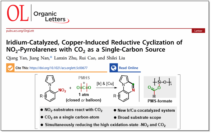 在有機合成領(lǐng)域,CO2與硝基化合物(-NO?)的反應(yīng)面臨嚴峻挑戰(zhàn),主要由于CO2熱力學(xué)穩(wěn)定難以活化,硝基則在強還原條件下才能轉(zhuǎn)化為胺。南江團隊在前期工作基礎(chǔ)上發(fā)展了一種以CO2作為單一碳源與硝基化合物的催化轉(zhuǎn)化新方法。該催化過程巧妙采用PMHS作為還原劑,在一次操作中同時實現(xiàn)了最高氧化態(tài)硝基和CO2的雙重還原。詳盡的機理研究表明,銥催化劑在還原NO2部分中起著至關(guān)重要的作用,而銅催化劑在后續(xù)的甲?;襟E和C?H環(huán)化步驟中具有雙重功能。該工作以“Iridium-Catalyzed, Copper-Induced Reductive Cyclization of NO2Pyrrolarenes with CO2 as a Single-Carbon Source”為題發(fā)表在有機化學(xué)領(lǐng)域國際知名期刊Organic Letters上,實驗工作主要由2022級博士生閆強完成。