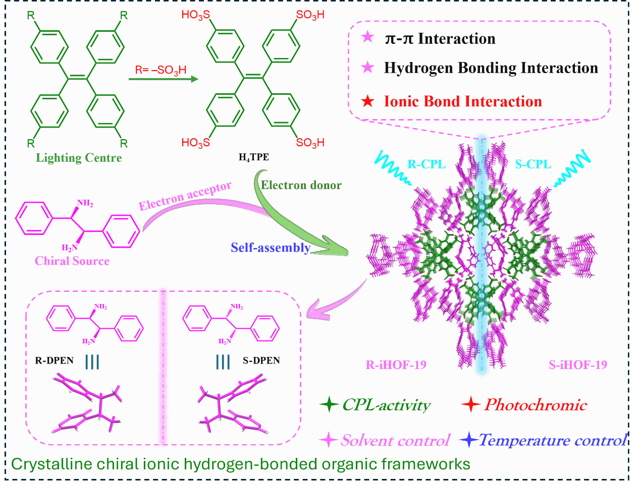近日,我?;W(xué)院曹麗慧教授團(tuán)隊通過離子型氫鍵有機(jī)框架(iHOFs)具有豐富的氫鍵受體和多樣性的結(jié)構(gòu)框架特性;利用它(分子共軛、質(zhì)子化效應(yīng)、電荷轉(zhuǎn)移和可逆結(jié)構(gòu)轉(zhuǎn)變)不同的光衰減路徑,設(shè)計得到了R/S-iHOF-19多功能的光學(xué)功能集合體。另外,氫鍵的鍵能要低于共價鍵的鍵能,更容易實(shí)現(xiàn)局部位點(diǎn)的斷鍵和二次成鍵,達(dá)到對材料性能的進(jìn)一步精準(zhǔn)調(diào)控。實(shí)現(xiàn)了刺激響應(yīng)型低溫光致變色、熒光、圓偏振發(fā)光等多種光學(xué)功能集成的晶態(tài)手性框架構(gòu)筑。并且探索了R/S-iHOF-19未來在多重高級加密防偽方面的潛在應(yīng)用。這項工作代表了為數(shù)不多的低溫刺激響應(yīng)型晶態(tài)手性超分子自組裝材料的系統(tǒng)研究,也表明了離子型氫鍵有機(jī)框架(iHOF)可以作為一個新的材料設(shè)計策略,為新材料的設(shè)計、開發(fā)、探索提供可參考的研究模型。相關(guān)工作在《Angew. Chem. Int. Ed》期刊上以“Temperature and Solvent Dual Switch Photochromic Chiral lonic Hydrogen-Bonded Organic Framework for circularly Polarized Luminescence and Advanced Encryption”為題發(fā)表,陜西科技大學(xué)為唯一通訊單位,化學(xué)與化工學(xué)院2024級博士研究生周斌為論文的第一作者,曹麗慧教授為唯一通訊作者。